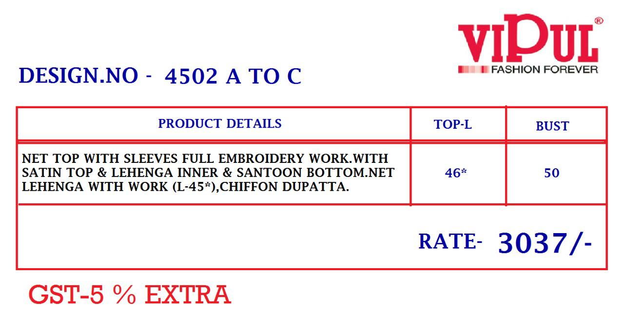 4502 Colours by Vipul . Set & Loose & Singel GST 5 Percent Extra. For singles price whatsapp on +919898838984 Delivery 5-6 days |