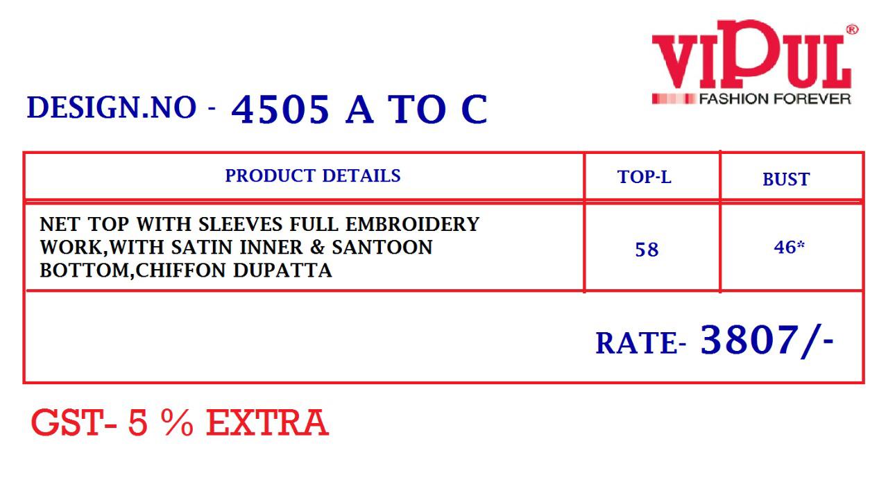 4505 Colours By Vipul . Set & Loose. GST 5 Percent Extra. For singles price whatsapp on +919898838984 Delivery 5-6 days . |