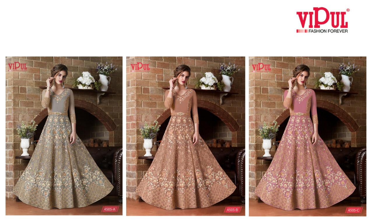 Buy Online 4505 Colours By Vipul Deaigner Anarkali Gown Collection Wholesale Dealer Surat 3 Pcs of Full Catalogue at Wholesale Price. Looking for 4505 Colours By Vipul Deaigner Anarkali Gown Collection Wholesale Dealer Surat Full Catalouge at Best Price? Buy Now 4505 Colours By Vipul Deaigner Anarkali Gown Collection Wholesale Dealer Surat at Wholesale Rate of Rs 11421 with Total 3 Pcs from authroized dealer and supplier of VIPUL Brand. Cost of Each piece is just only Rs 3807 which is very low and affordable price to resale the product in your retail store ,This is Surat based Wholesale Supplier & Dealer of VIPUL Brand. Click on Brand name to Know more about VIPUL Brand's products.Call or Whatsapp on 9898838984 for booking or enquiry