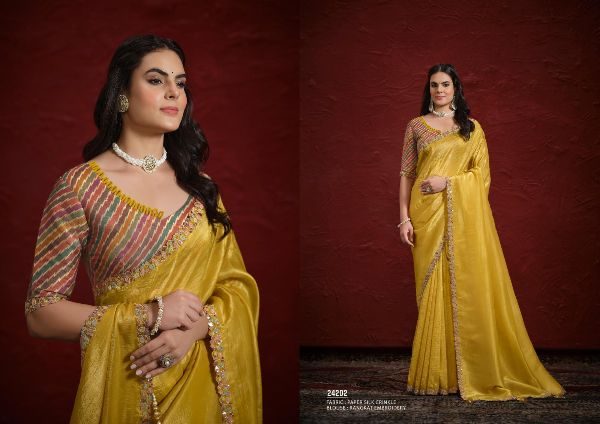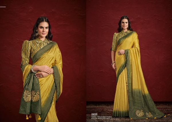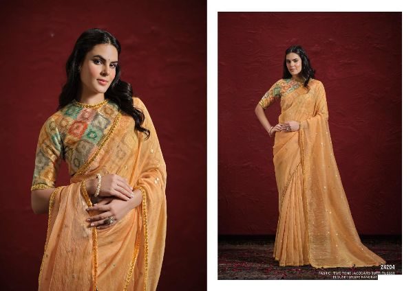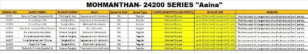 BRAND NAME : MAHOTSAV CATALOG : "MOH-MANTHAN-24200 SERIES AAINA PRICE :- 24201-2485/- 24202-2365/- 24203-2825/- 24204-2885/- 24205-2245/- 24206-2795/- 24207-2795/- 24208-2575/- 24209-2375/- +5% GST EXTRA FABRIC -: ATTACHED BLOUSE TYPE: STITCHED BLOUSE SIZE : up to 38 Inch with a margin of 42 inches SINGLES AVAILABLE 100+ SINGLE |