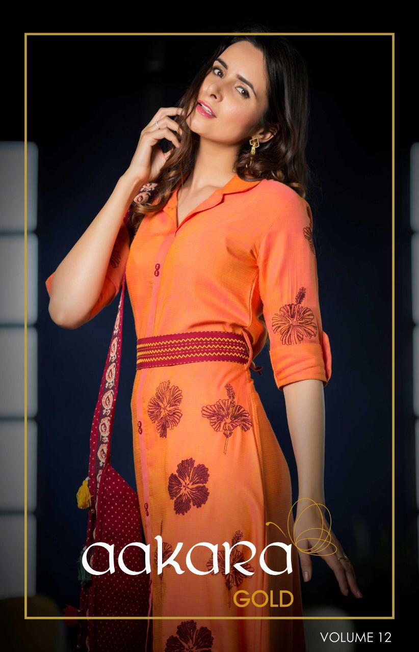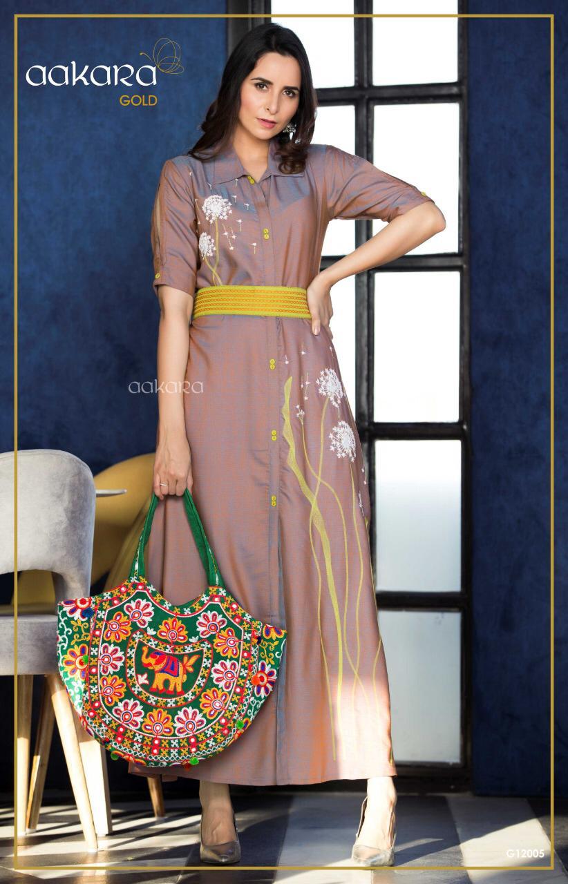 ??Aakara announces launch of designer gown with heavy embroidery and embroidered belts catalog ***Aakara Gold 12*** ?? *Brand*- AAKARA ? *Type* - Gown style long Kurti with placement embroidery and fabric embroidered belts? *Fabric* - Dual Tone Weaved Rayon *Designs* - 6 *Size Options*- M(38Â?), L(40Â?), XL (42Â?), XXL (44Â?) **Price @ Rs. 799 (GST extra)* *Dispatch - ***13th Feb*** _(Note: Bags are used only for photography accessory and will not come with catalog)_ |