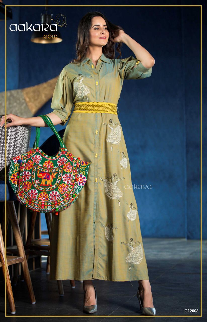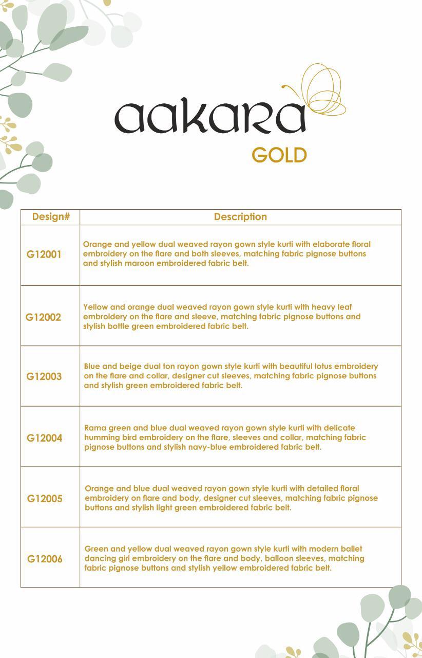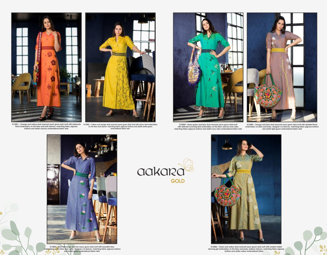 Buy Online Aakara Gold 12 By Aakara Gown Style Long Kurtis Collection Wholesale Supplier Gujarat 6 Pcs of Full Catalogue at Wholesale Price. Looking for Aakara Gold 12 By Aakara Gown Style Long Kurtis Collection Wholesale Supplier Gujarat Full Catalouge at Best Price? Buy Now Aakara Gold 12 By Aakara Gown Style Long Kurtis Collection Wholesale Supplier Gujarat at Wholesale Rate of Rs 4794 with Total 6 Pcs from authroized dealer and supplier of BRAND'S Brand. Cost of Each piece is just only Rs 799 which is very low and affordable price to resale the product in your retail store ,This is Surat based Wholesale Supplier & Dealer of BRAND'S Brand. Click on Brand name to Know more about BRAND'S Brand's products.Call or Whatsapp on 9898838984 for booking or enquiry