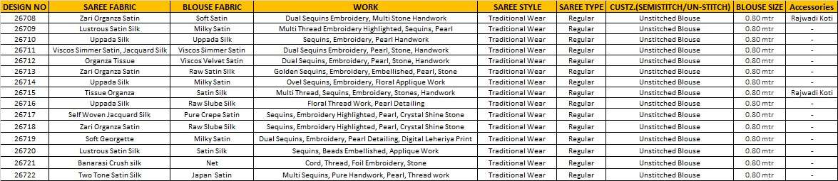 *PRICE :-* *26708-4205/-* *26709-3855/-* *26710-3075/-* *26712-3575/-* *26713-3515/-* *26714-3845/-* *26715-3995/-* *26719-3155/-* *26722-4205/-* +*5% GST EXTRA*
