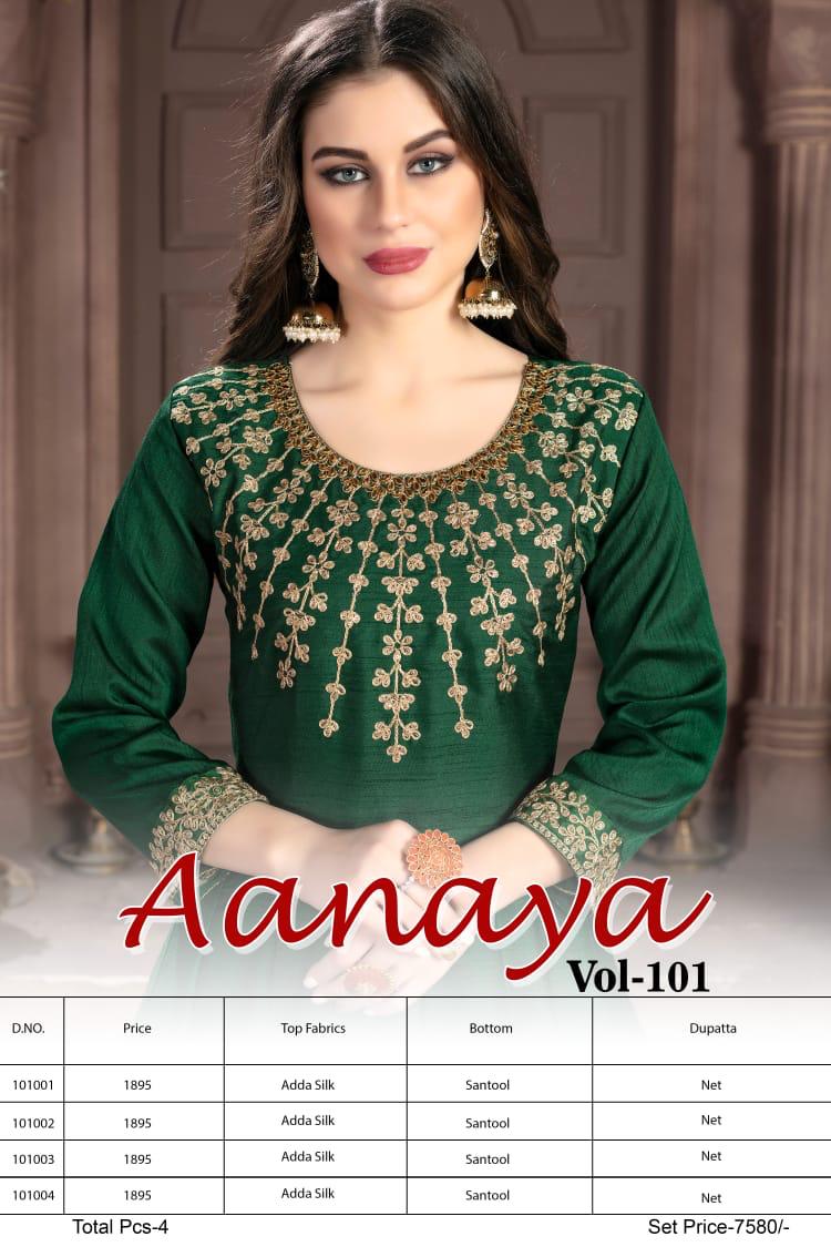 Buy Online Aanaya Series 1000 Vol 101 Designer Party Wear Suits Wholesale Supplier Gujarat 4 Pcs of Full Catalogue at Wholesale Price. Looking for Aanaya Series 1000 Vol 101 Designer Party Wear Suits Wholesale Supplier Gujarat Full Catalouge at Best Price? Buy Now Aanaya Series 1000 Vol 101 Designer Party Wear Suits Wholesale Supplier Gujarat at Wholesale Rate of Rs 7580 with Total 4 Pcs from authroized dealer and supplier of AANAYA Brand. Cost of Each piece is just only Rs 1895 which is very low and affordable price to resale the product in your retail store ,This is Surat based Wholesale Supplier & Dealer of AANAYA Brand. Click on Brand name to Know more about AANAYA Brand's products.Call or Whatsapp on 9898838984 for booking or enquiry