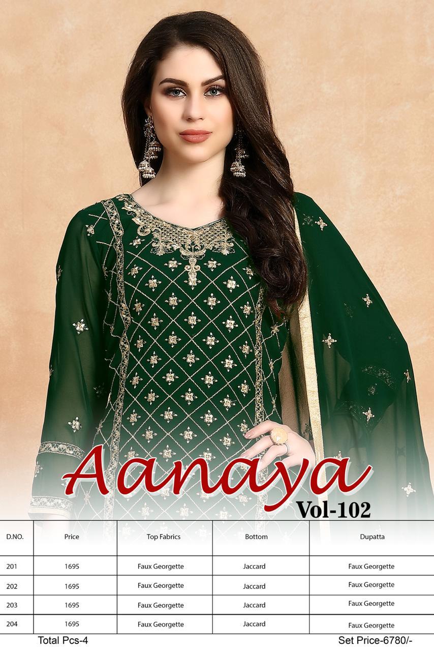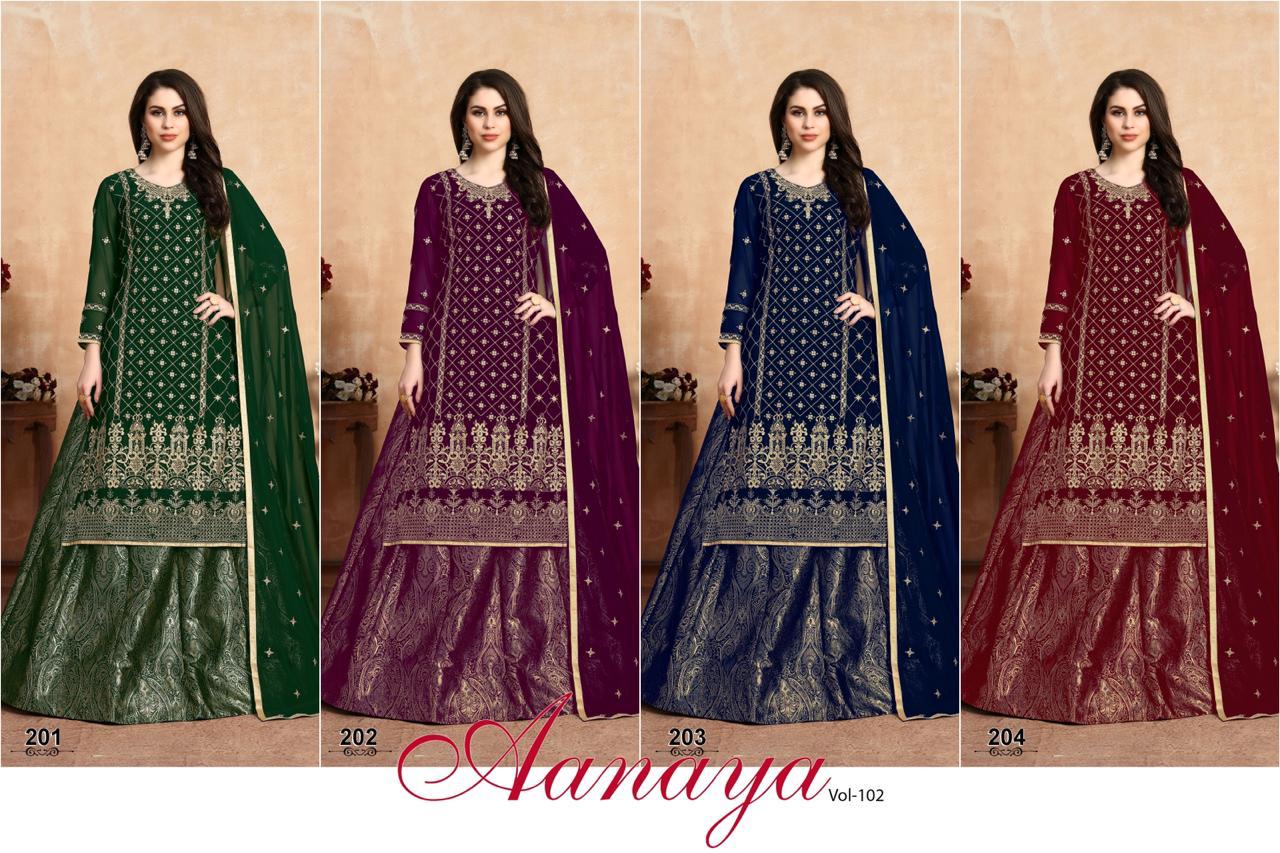 Buy Online Aanaya Series 200 Vol 102 Designer Occasional Wear Dress Set And Single Wholesale Supplier Gujarat 4 Pcs of Full Catalogue at Wholesale Price. Looking for Aanaya Series 200 Vol 102 Designer Occasional Wear Dress Set And Single Wholesale Supplier Gujarat Full Catalouge at Best Price? Buy Now Aanaya Series 200 Vol 102 Designer Occasional Wear Dress Set And Single Wholesale Supplier Gujarat at Wholesale Rate of Rs 6780 with Total 4 Pcs from authroized dealer and supplier of AANAYA Brand. Cost of Each piece is just only Rs 1695 which is very low and affordable price to resale the product in your retail store ,This is Surat based Wholesale Supplier & Dealer of AANAYA Brand. Click on Brand name to Know more about AANAYA Brand's products.Call or Whatsapp on 9898838984 for booking or enquiry