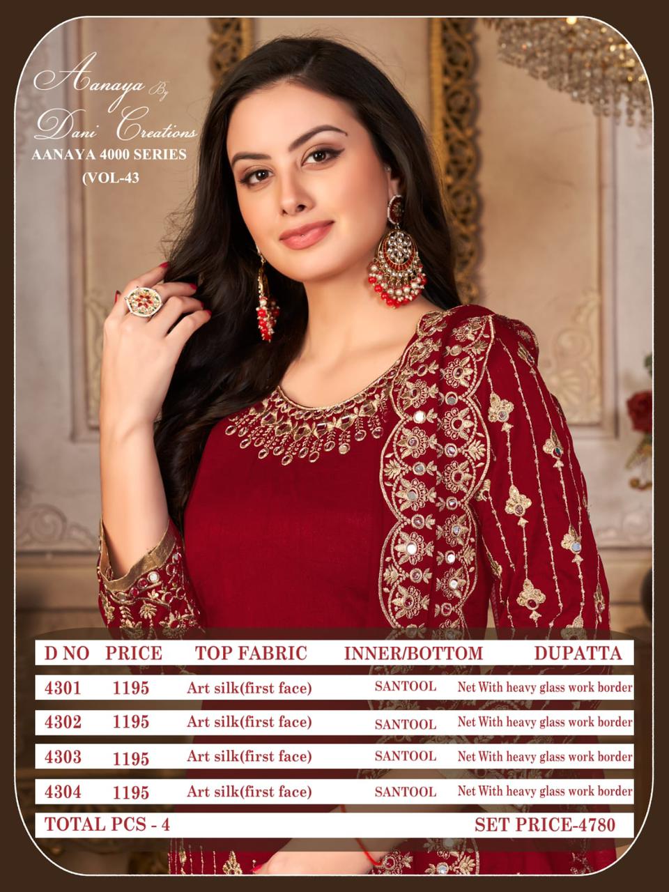 Buy Online Aanaya Vol 143 By Dani Creation Designer Suit Single And Set Stockiest And Supplier From Surat 4 Pcs of Full Catalogue at Wholesale Price. Looking for Aanaya Vol 143 By Dani Creation Designer Suit Single And Set Stockiest And Supplier From Surat Full Catalouge at Best Price? Buy Now Aanaya Vol 143 By Dani Creation Designer Suit Single And Set Stockiest And Supplier From Surat at Wholesale Rate of Rs 4780 with Total 4 Pcs from authroized dealer and supplier of Brand. Cost of Each piece is just only Rs 1195 which is very low and affordable price to resale the product in your retail store ,This is Surat based Wholesale Supplier & Dealer of Brand. Click on Brand name to Know more about Brand's products.Call or Whatsapp on 9898838984 for booking or enquiry