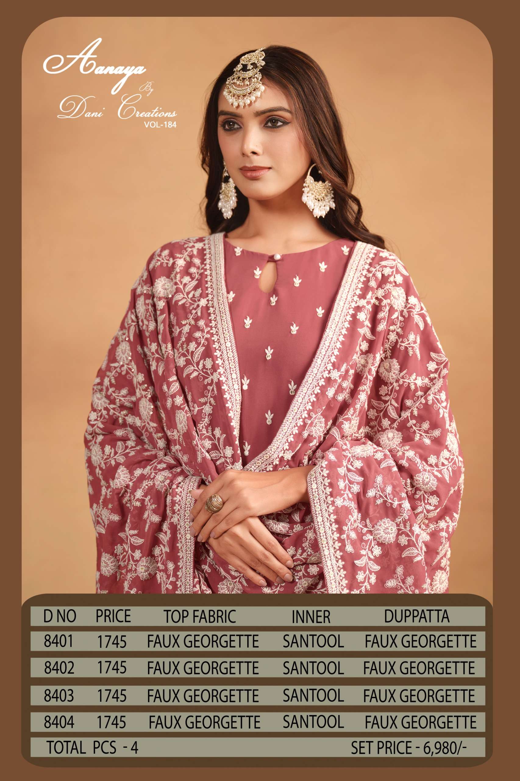 Buy Online AANAYA VOL 184 S by Dani creation suit collection manufacturers surat 4 Pcs of Full Catalogue at Wholesale Price. Looking for AANAYA VOL 184 S by Dani creation suit collection manufacturers surat Full Catalouge at Best Price? Buy Now AANAYA VOL 184 S by Dani creation suit collection manufacturers surat at Wholesale Rate of Rs 6980 with Total 4 Pcs from authroized dealer and supplier of Dani Creation Brand. Cost of Each piece is just only Rs 1745 which is very low and affordable price to resale the product in your retail store ,This is Surat based Wholesale Supplier & Dealer of Dani Creation Brand. Click on Brand name to Know more about Dani Creation Brand's products.Call or Whatsapp on 9898838984 for booking or enquiry