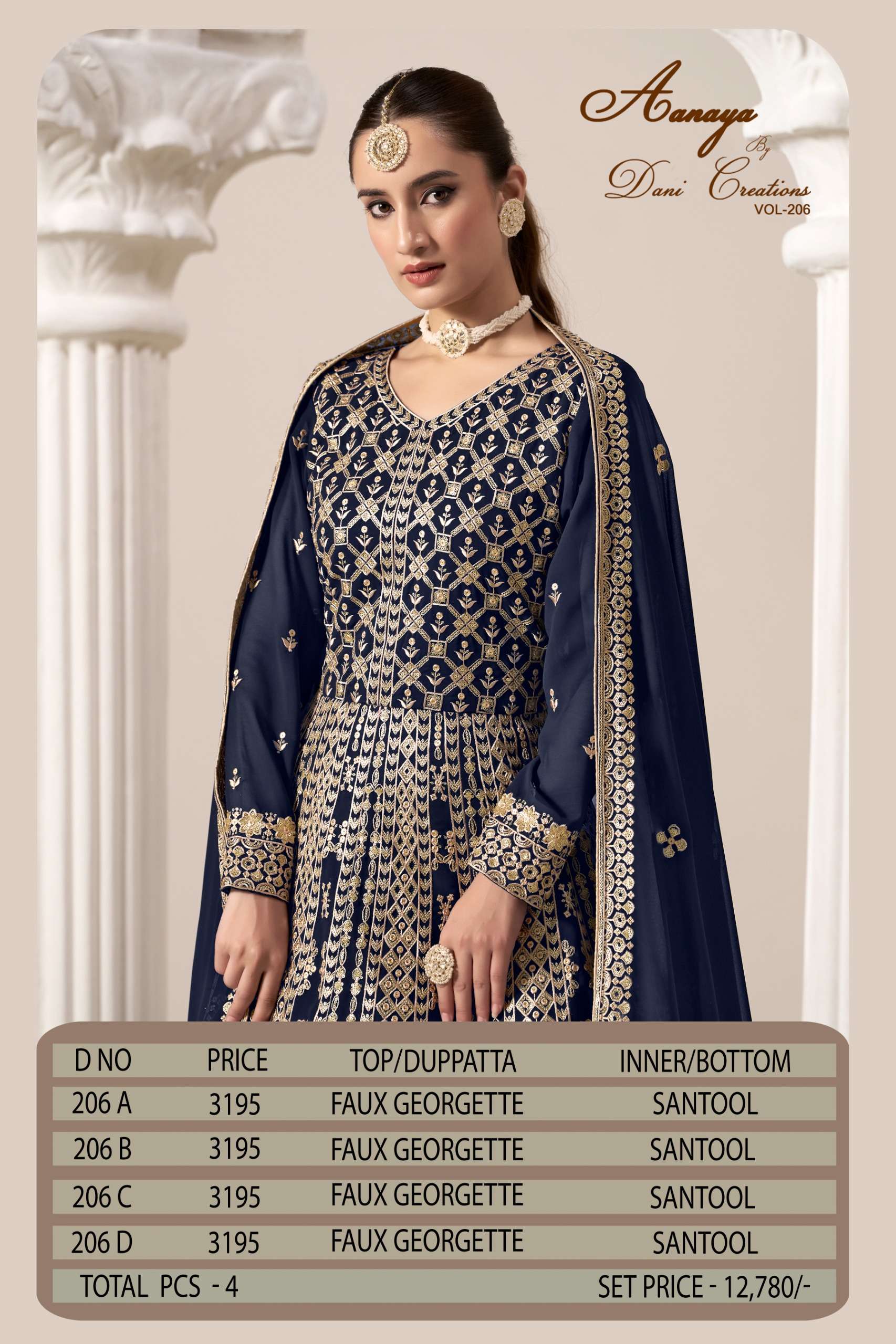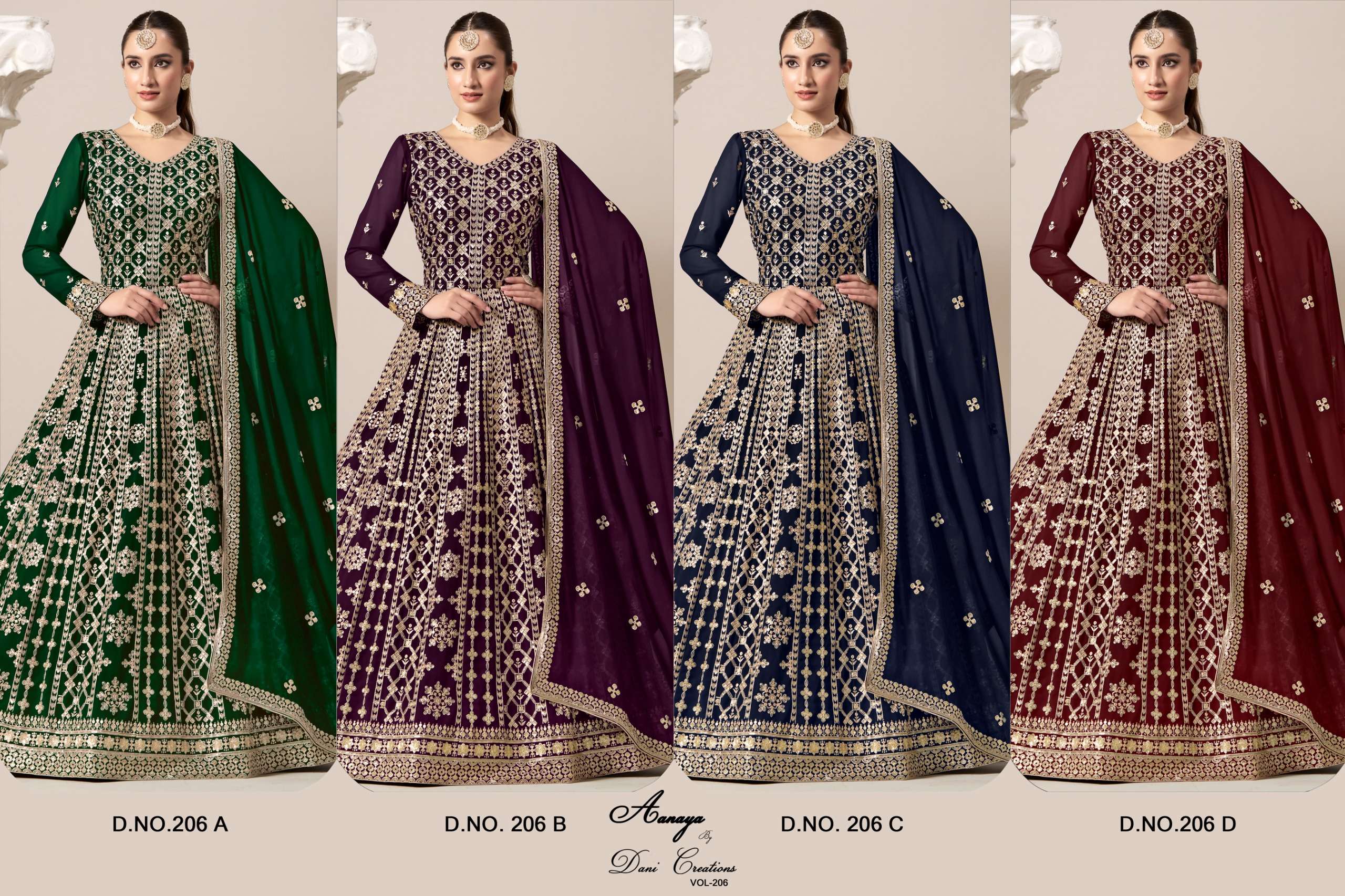 Buy Online AANAYA VOL 206 by Dani creation gown collection manufacturers surat 4 Pcs of Full Catalogue at Wholesale Price. Looking for AANAYA VOL 206 by Dani creation gown collection manufacturers surat Full Catalouge at Best Price? Buy Now AANAYA VOL 206 by Dani creation gown collection manufacturers surat at Wholesale Rate of Rs 12780 with Total 4 Pcs from authroized dealer and supplier of Dani Creation Brand. Cost of Each piece is just only Rs 3195 which is very low and affordable price to resale the product in your retail store ,This is Surat based Wholesale Supplier & Dealer of Dani Creation Brand. Click on Brand name to Know more about Dani Creation Brand's products.Call or Whatsapp on 9898838984 for booking or enquiry