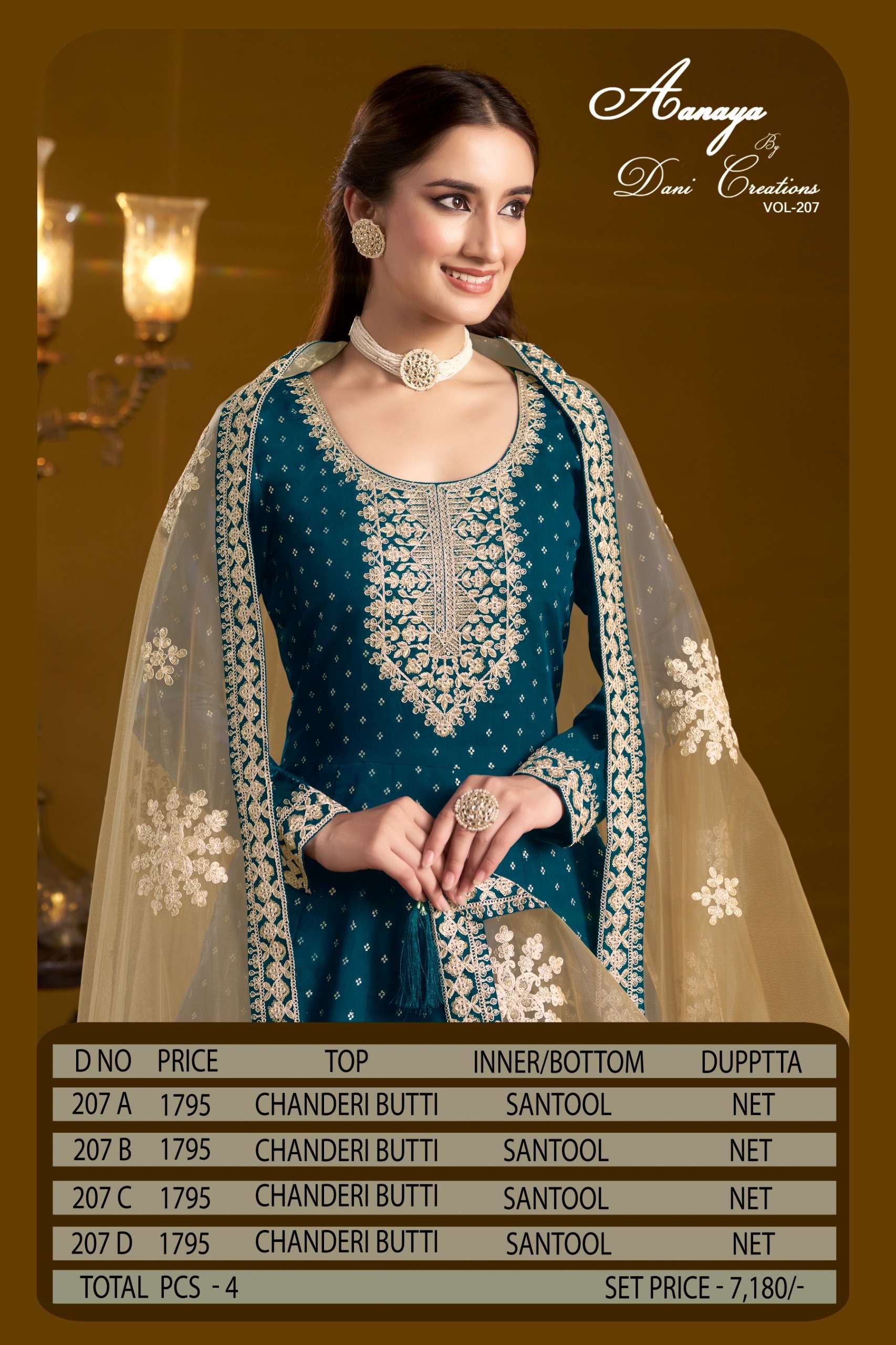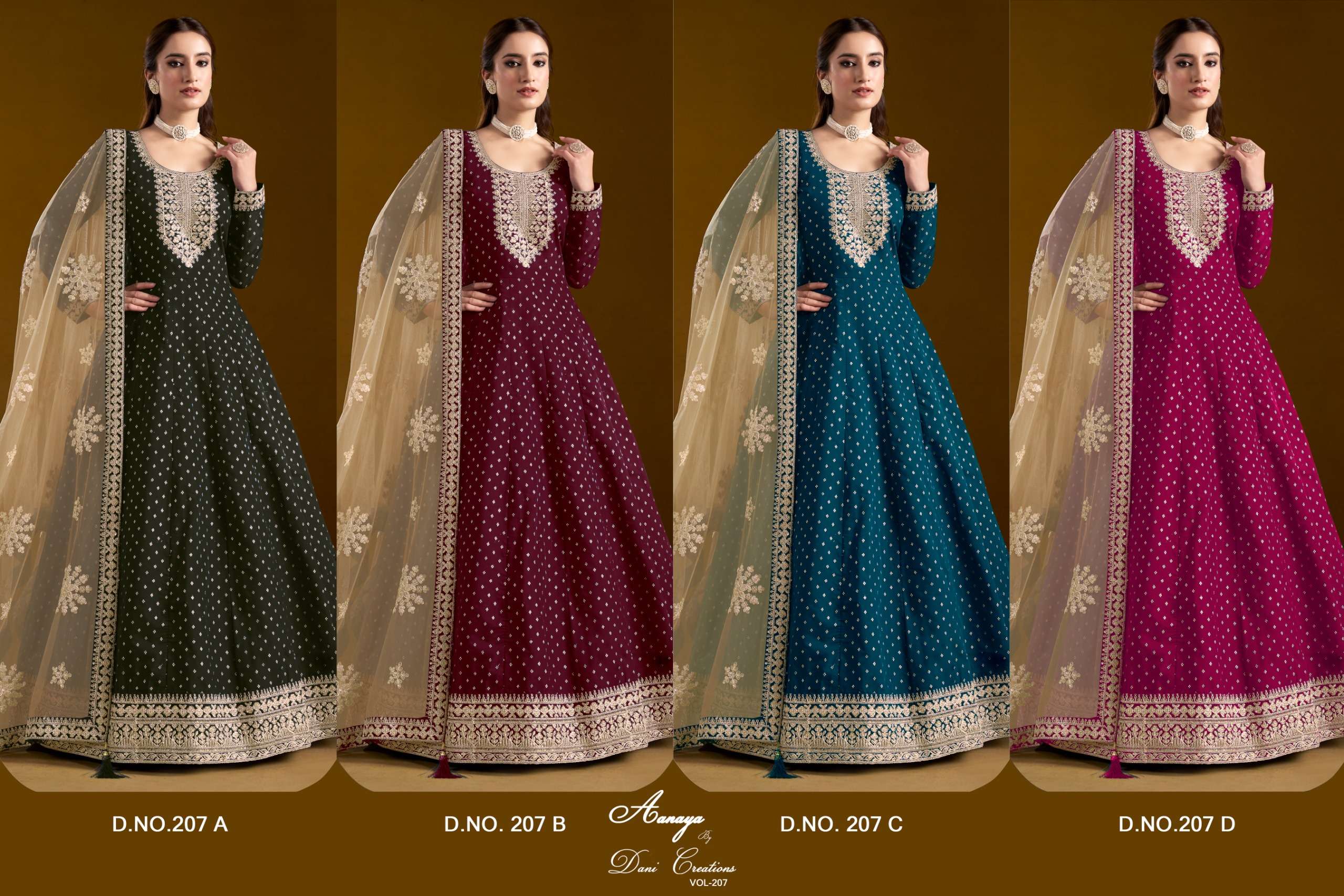 Buy Online AANAYA VOL 207 by Dani creation gown collection manufacturers surat 4 Pcs of Full Catalogue at Wholesale Price. Looking for AANAYA VOL 207 by Dani creation gown collection manufacturers surat Full Catalouge at Best Price? Buy Now AANAYA VOL 207 by Dani creation gown collection manufacturers surat at Wholesale Rate of Rs 7180 with Total 4 Pcs from authroized dealer and supplier of Dani Creation Brand. Cost of Each piece is just only Rs 1795 which is very low and affordable price to resale the product in your retail store ,This is Surat based Wholesale Supplier & Dealer of Dani Creation Brand. Click on Brand name to Know more about Dani Creation Brand's products.Call or Whatsapp on 9898838984 for booking or enquiry