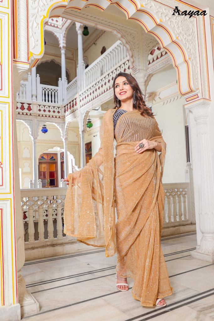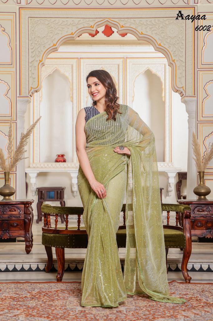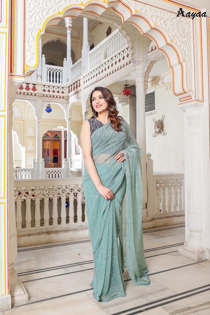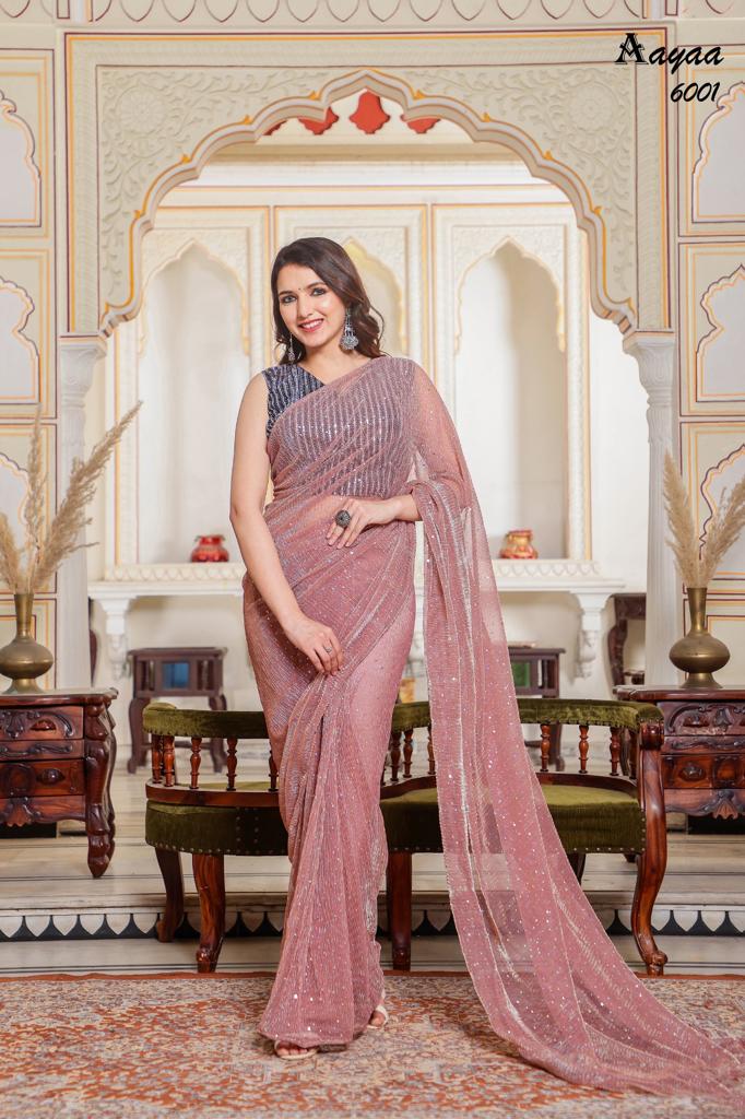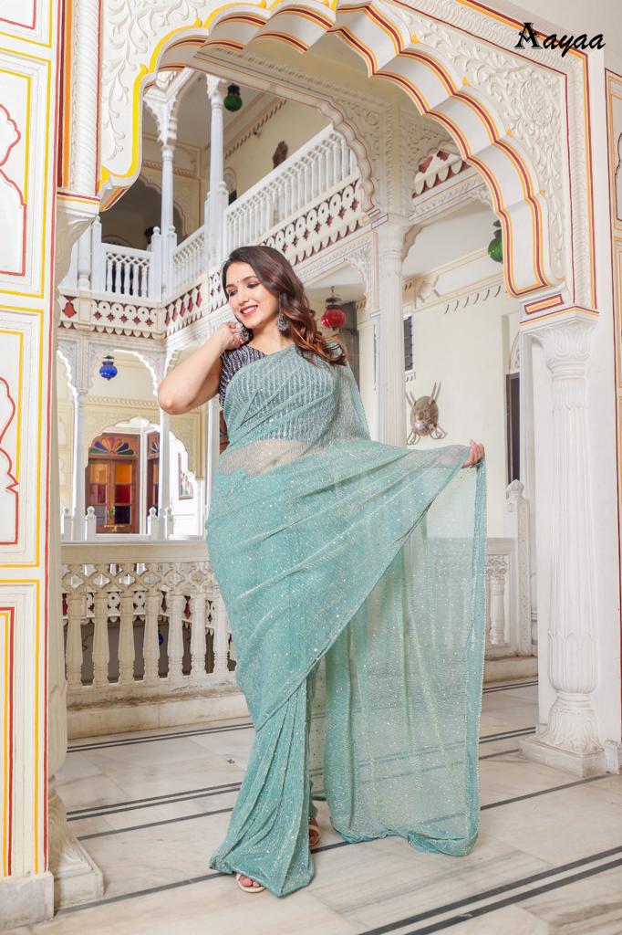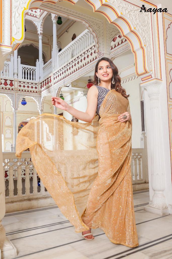 Catalog name Â? Aaradhna vol 6 BY Aayaa Fabric Details:- Saree :- Heavy Natting Fabric Blouse:- Satin Silk Saree work :- Tikli Work Blouse work - Sequence work Length :- Saree Â? 5.50 mtr Blouse Â? 0.80 mtr Rate Â? 1179/- Gst ship extra 100+single |