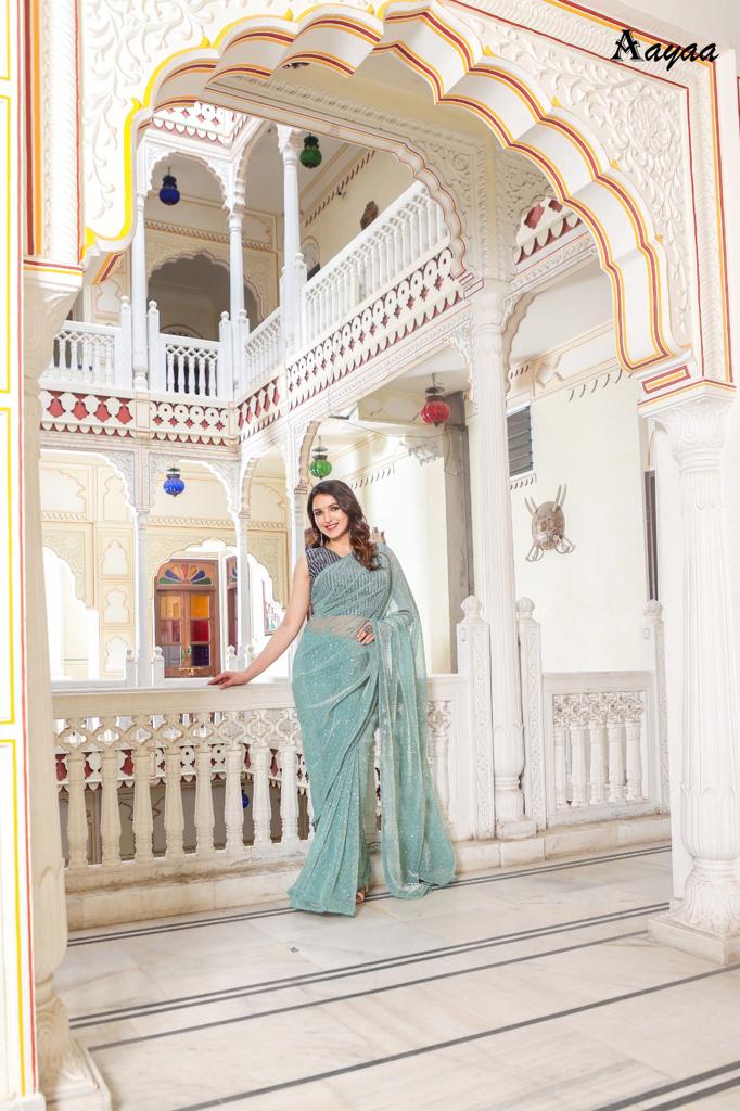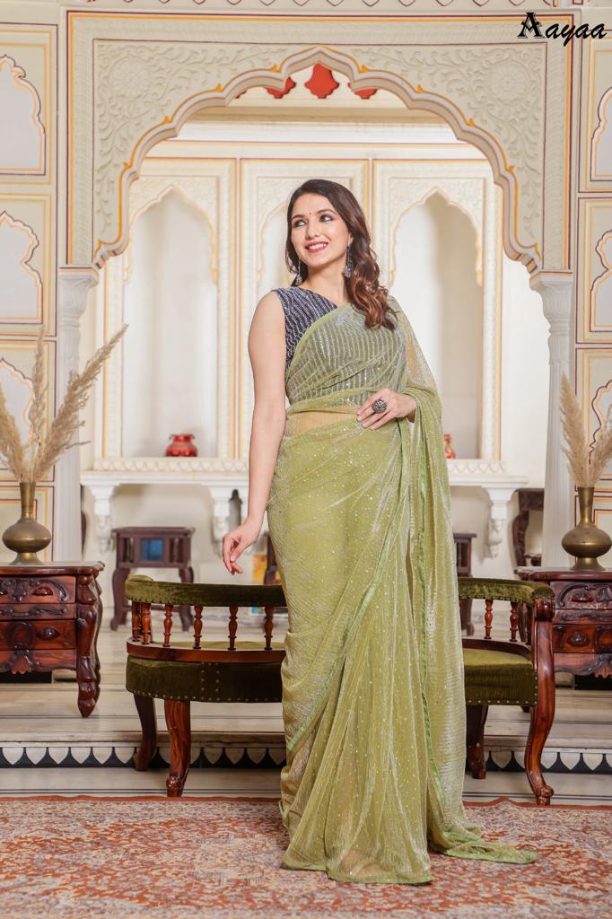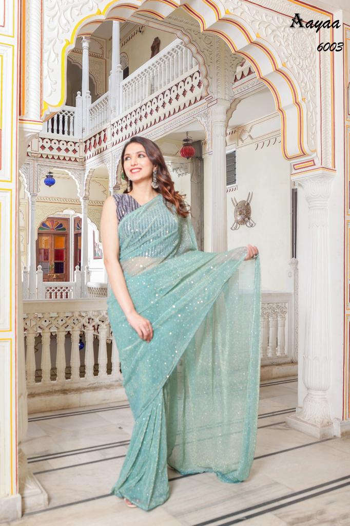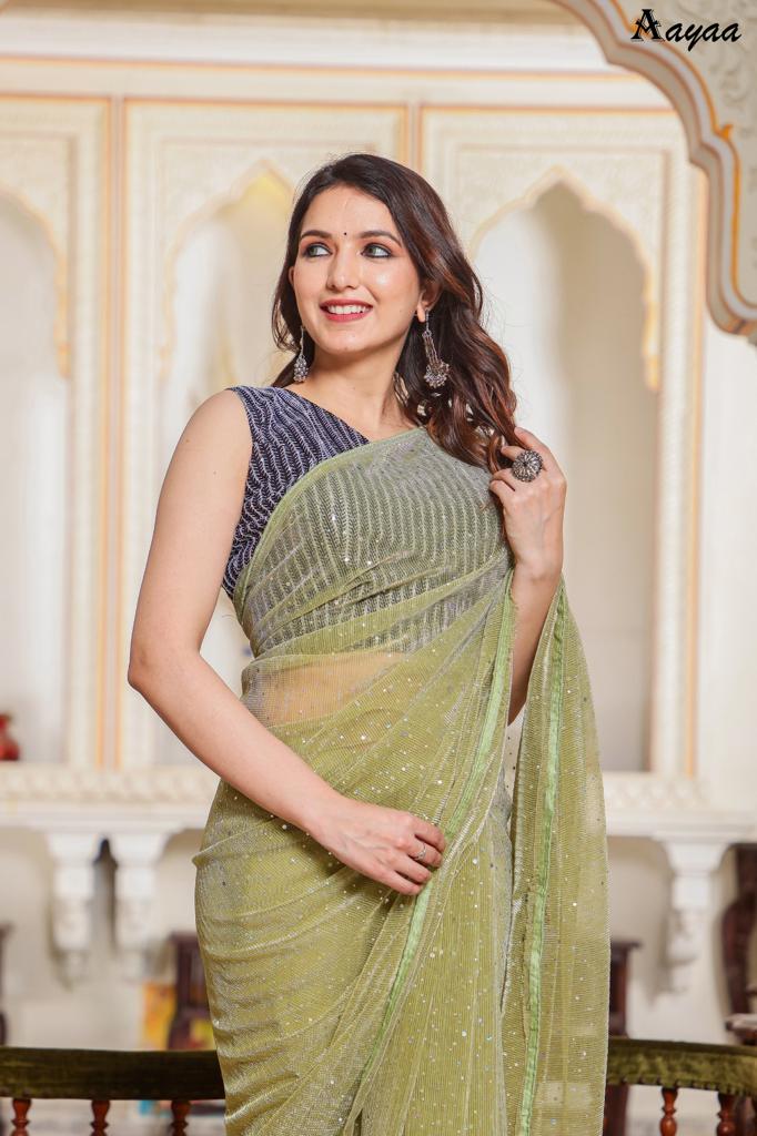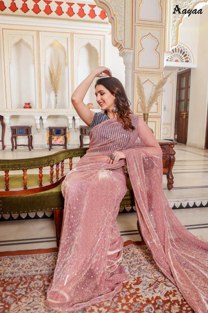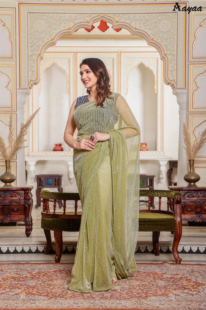 Catalog name Â? Aaradhna vol 6 BY Aayaa Fabric Details:- Saree :- Heavy Natting Fabric Blouse:- Satin Silk Saree work :- Tikli Work Blouse work - Sequence work Length :- Saree Â? 5.50 mtr Blouse Â? 0.80 mtr Rate Â? 1179/- Gst ship extra 100+single |