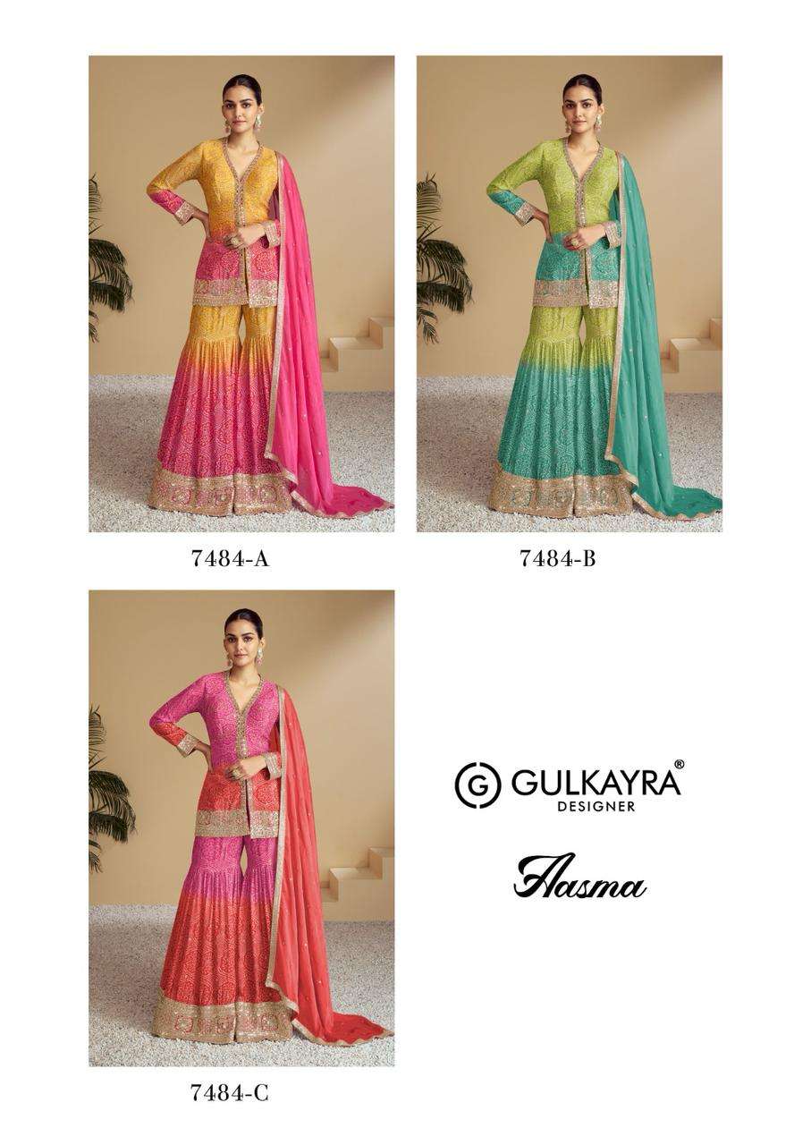 Buy Online AASMA by Gulkayra Designer suit collection manufacturer Surat 3 Pcs of Full Catalogue at Wholesale Price. Looking for AASMA by Gulkayra Designer suit collection manufacturer Surat Full Catalouge at Best Price? Buy Now AASMA by Gulkayra Designer suit collection manufacturer Surat at Wholesale Rate of Rs 8085 with Total 3 Pcs from authroized dealer and supplier of Gulkayra designer Brand. Cost of Each piece is just only Rs 2695 which is very low and affordable price to resale the product in your retail store ,This is Surat based Wholesale Supplier & Dealer of Gulkayra designer Brand. Click on Brand name to Know more about Gulkayra designer Brand's products.Call or Whatsapp on 9898838984 for booking or enquiry