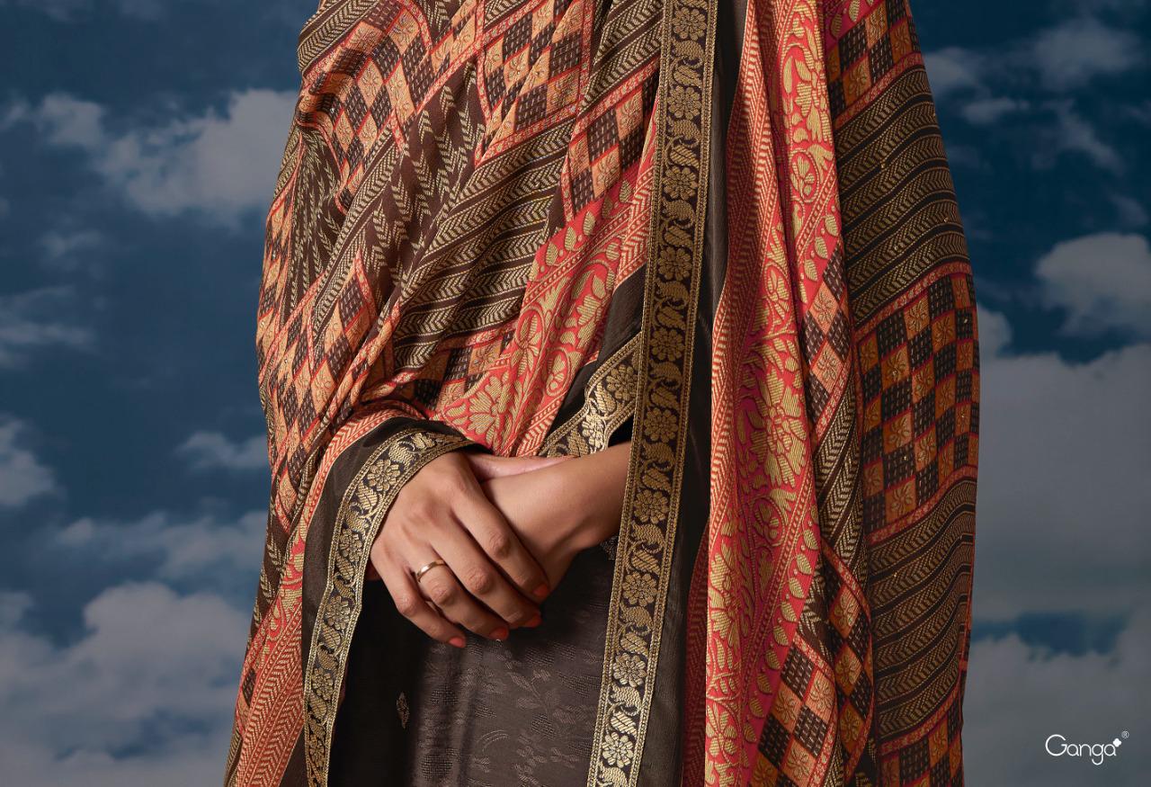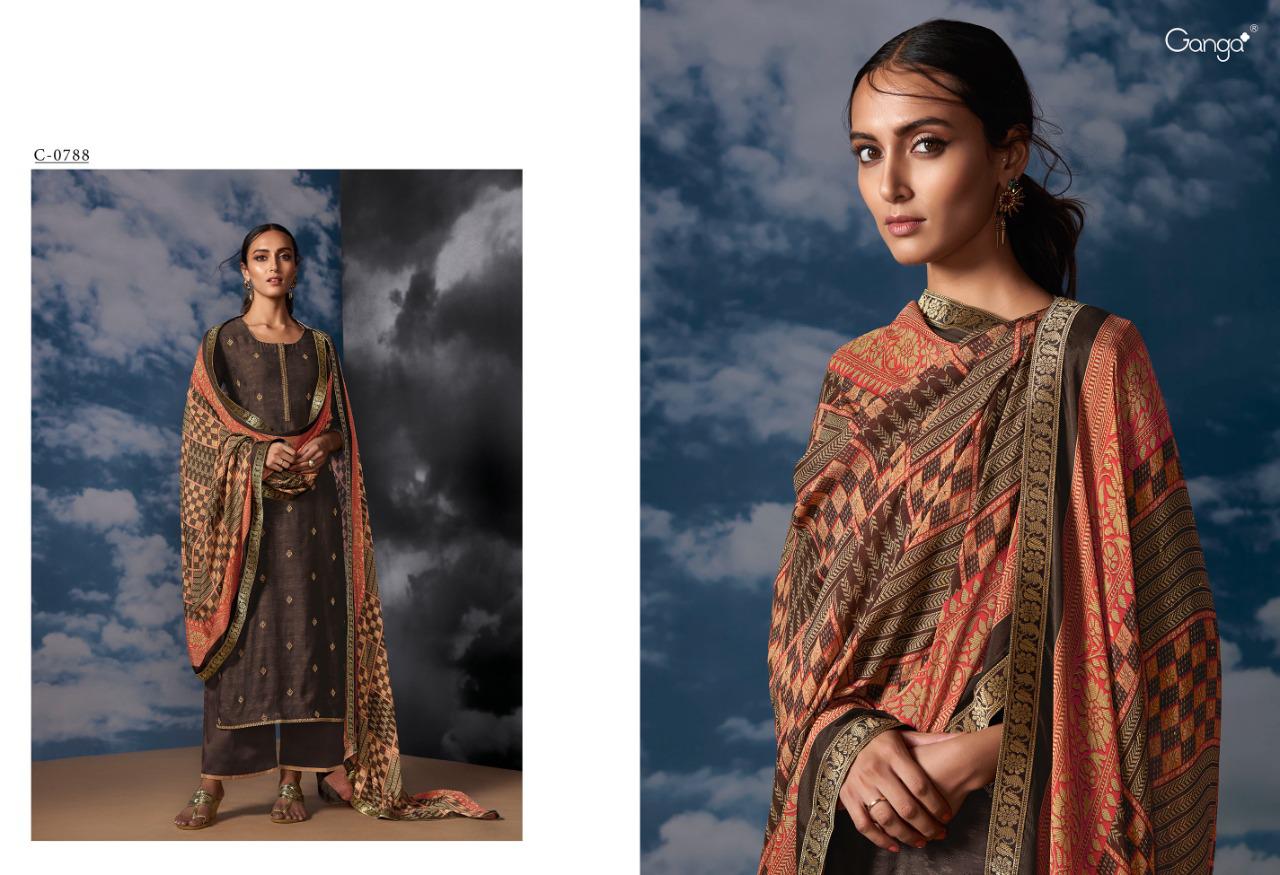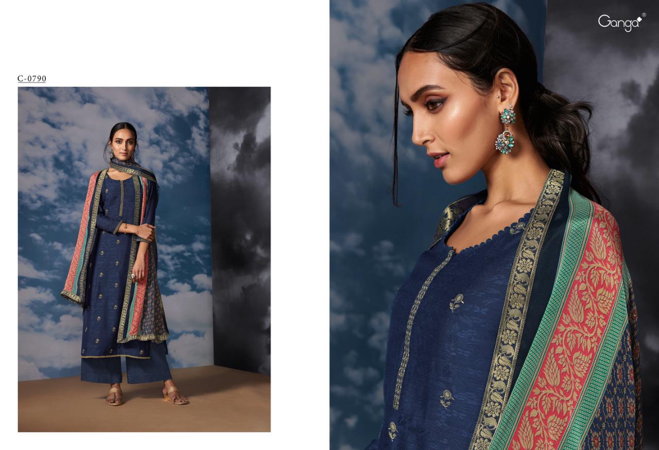 *GANGA* PRESENTS *ABHERI* *SERIES:* 785 TO 790 *TOP:* PURE BEMBERG SILK JACQUARD WITH EMRBOIDERY *BOTTOM:* SILKY COTTON SATIN *DUPATTA:* PURE CHINON SILK PRINTED WITH BANARSI JACQUARD BORDER *DESIGNS:* 06 |