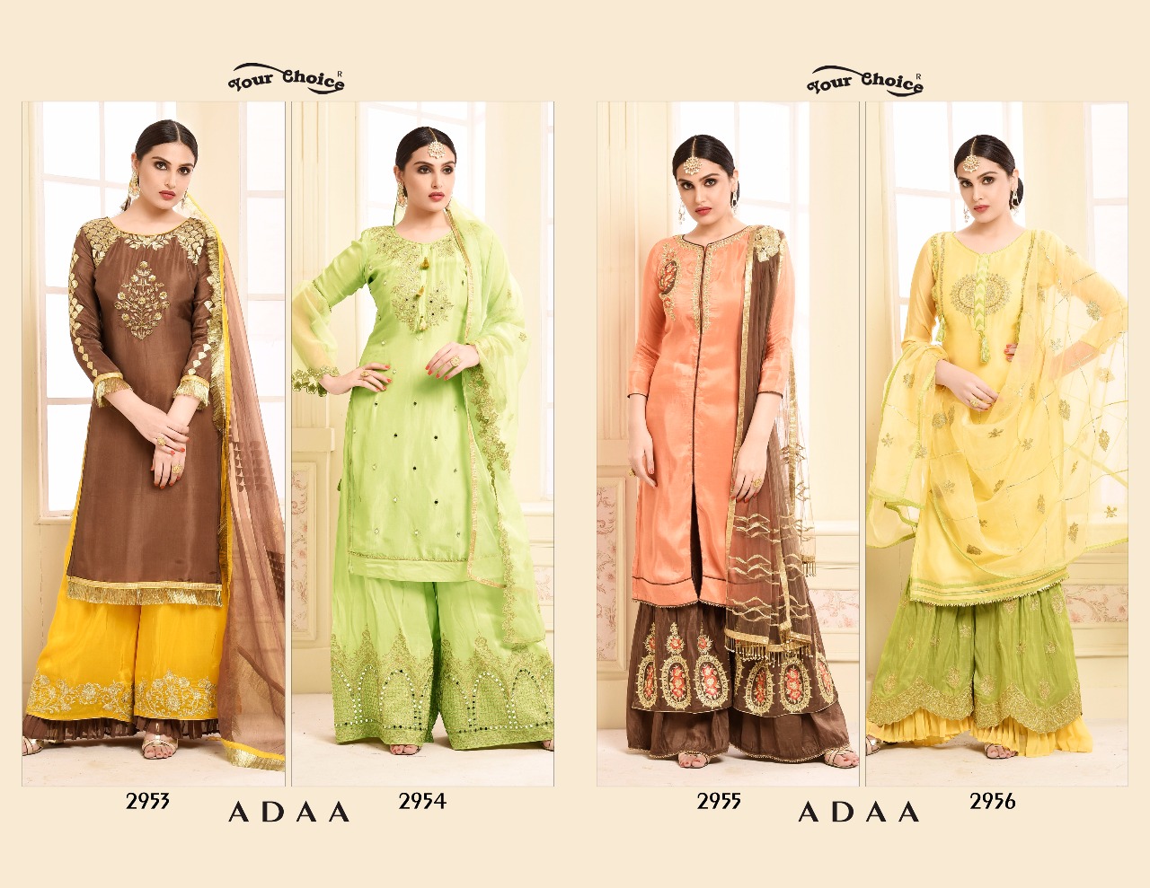 Buy Online Adaa By Your Choice Designer Sarara In Jam Silk Cotton With An Embroidary Series 2953 To 2956 Wholesale Dealer And Supplier Surat 4 Pcs of Full Catalogue at Wholesale Price. Looking for Adaa By Your Choice Designer Sarara In Jam Silk Cotton With An Embroidary Series 2953 To 2956 Wholesale Dealer And Supplier Surat Full Catalouge at Best Price? Buy Now Adaa By Your Choice Designer Sarara In Jam Silk Cotton With An Embroidary Series 2953 To 2956 Wholesale Dealer And Supplier Surat at Wholesale Rate of Rs 6380 with Total 4 Pcs from authroized dealer and supplier of YOUR CHOICE Brand. Cost of Each piece is just only Rs 1595 which is very low and affordable price to resale the product in your retail store ,This is Surat based Wholesale Supplier & Dealer of YOUR CHOICE Brand. Click on Brand name to Know more about YOUR CHOICE Brand's products.Call or Whatsapp on 9898838984 for booking or enquiry