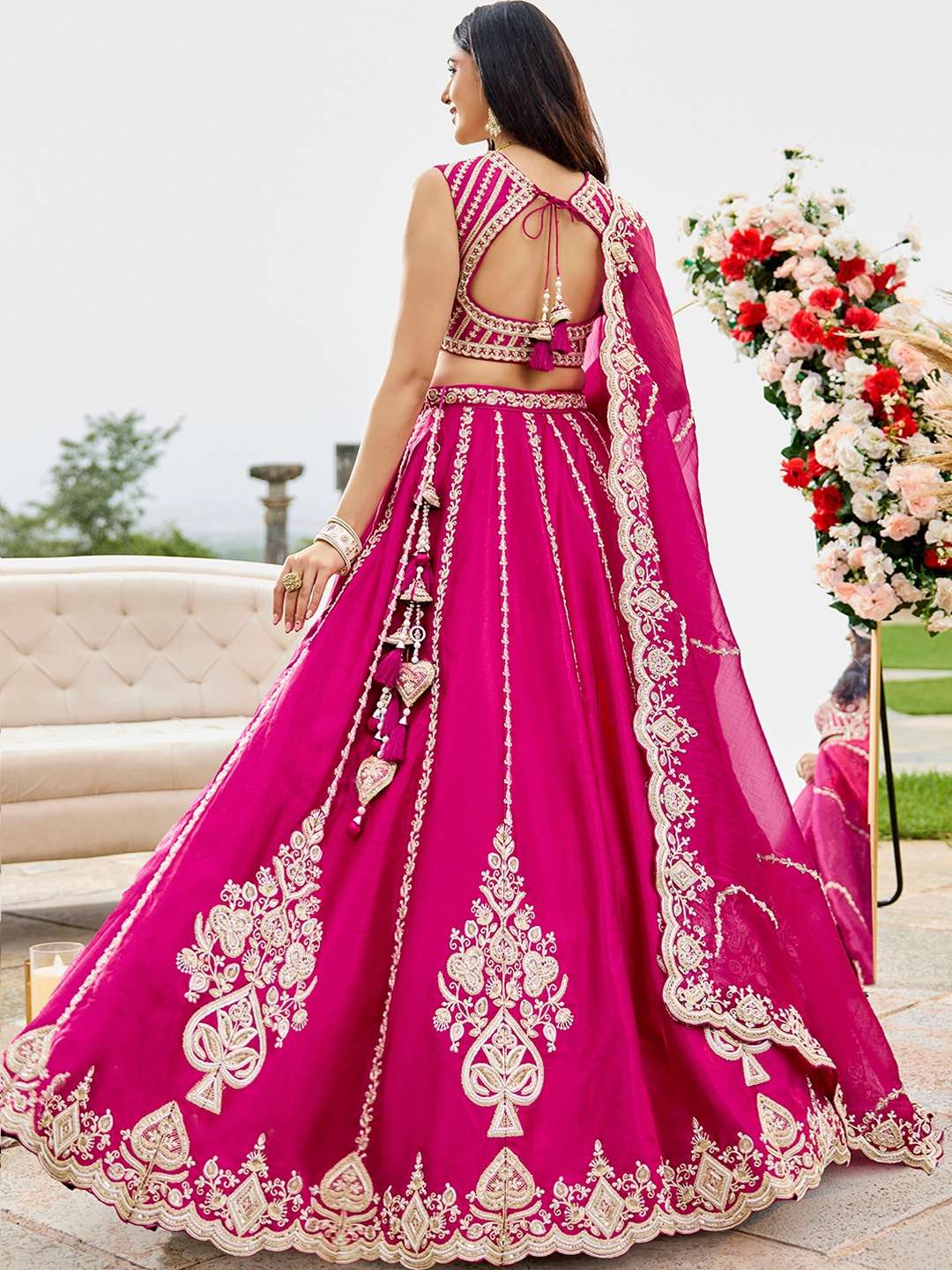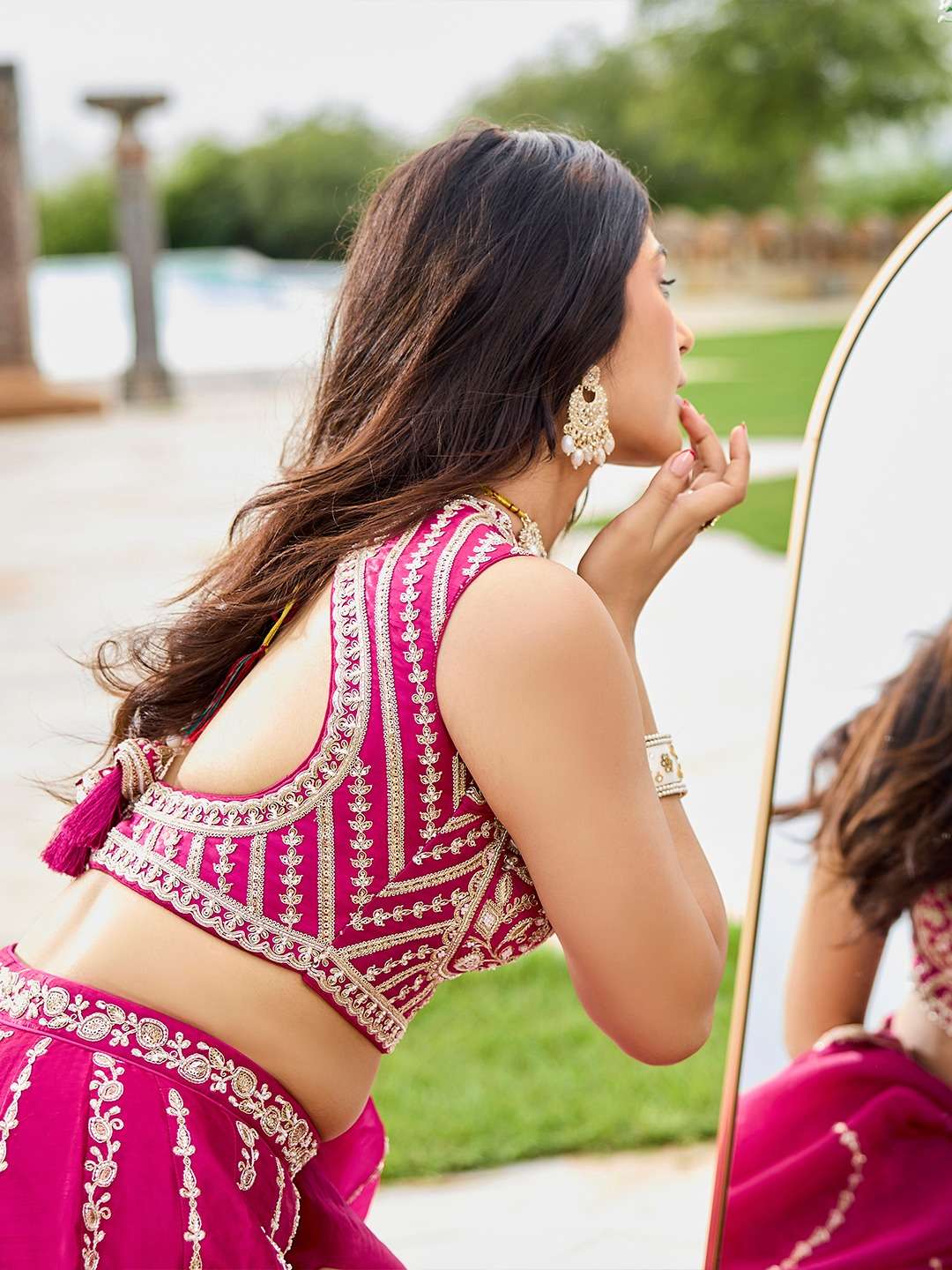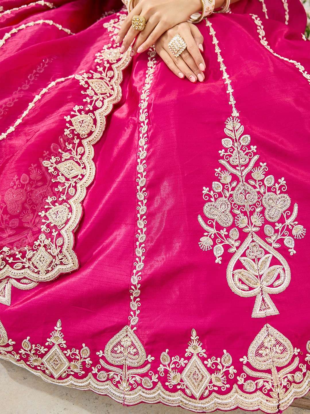 👗 Lehenga: Elegant semi-stitched lehenga crafted in premium Silk fabric with heavy beads, sequins, coding and thread embroidery work. Lehenga comes with beautiful thread cutwork border on the hemline and 4 meter full flair for a rich royal look.