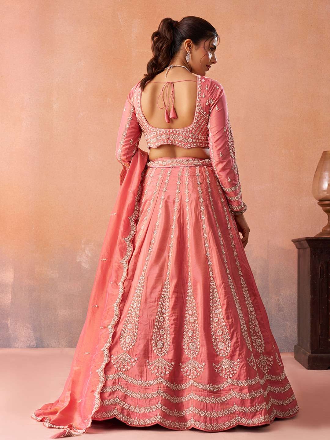 ✨ Lehenga Premium Peach Tissue fabric lehenga with Heavy Beads & Sequins Floral Embroidery Work. • 3.5 Meter beautiful flair • Heavy cutwork border on hemline • Double Shantoon inner • Can-can (12 & 18 inch) for perfect volume • Buckram (4 & 12 inch) for shape