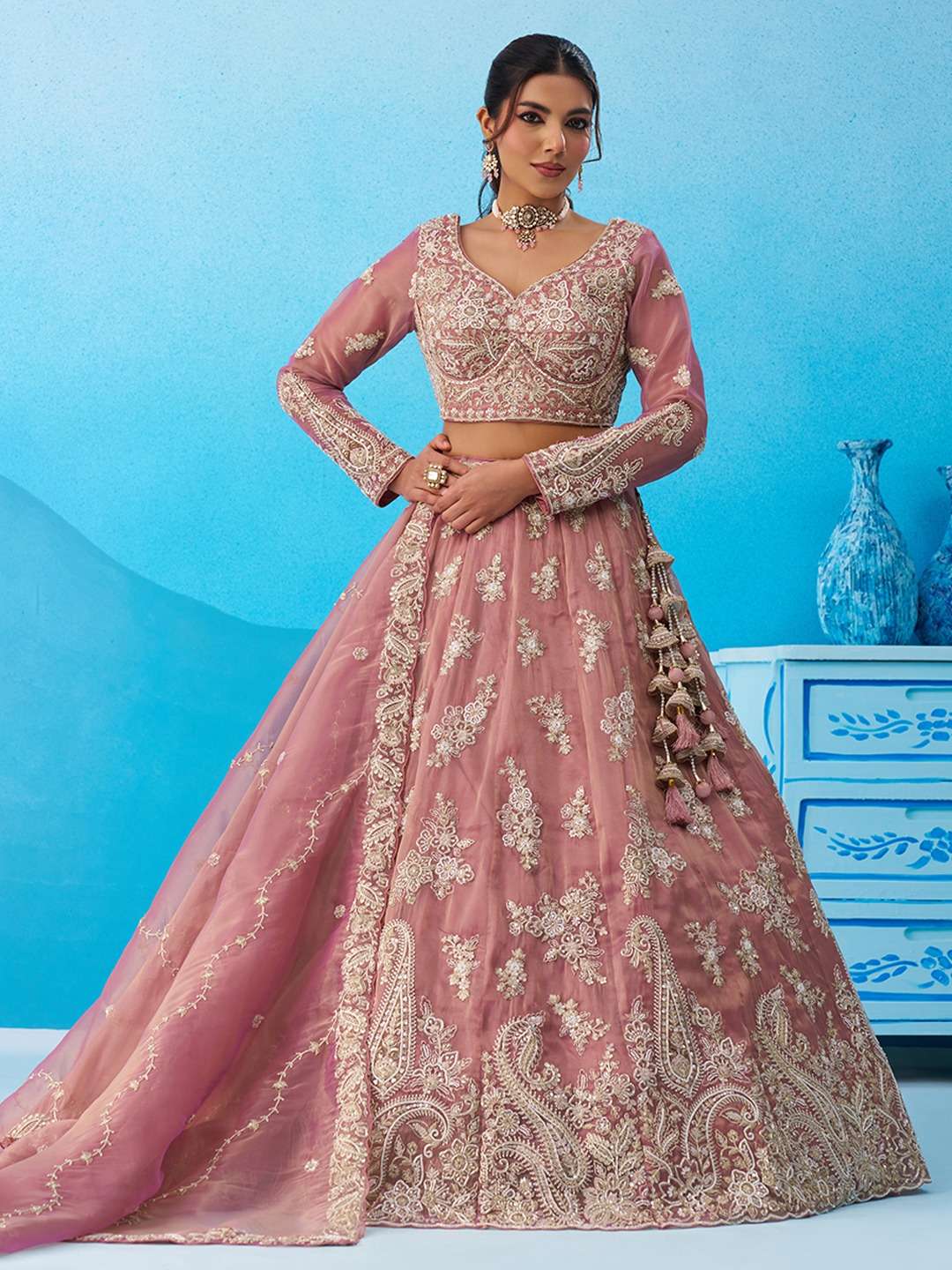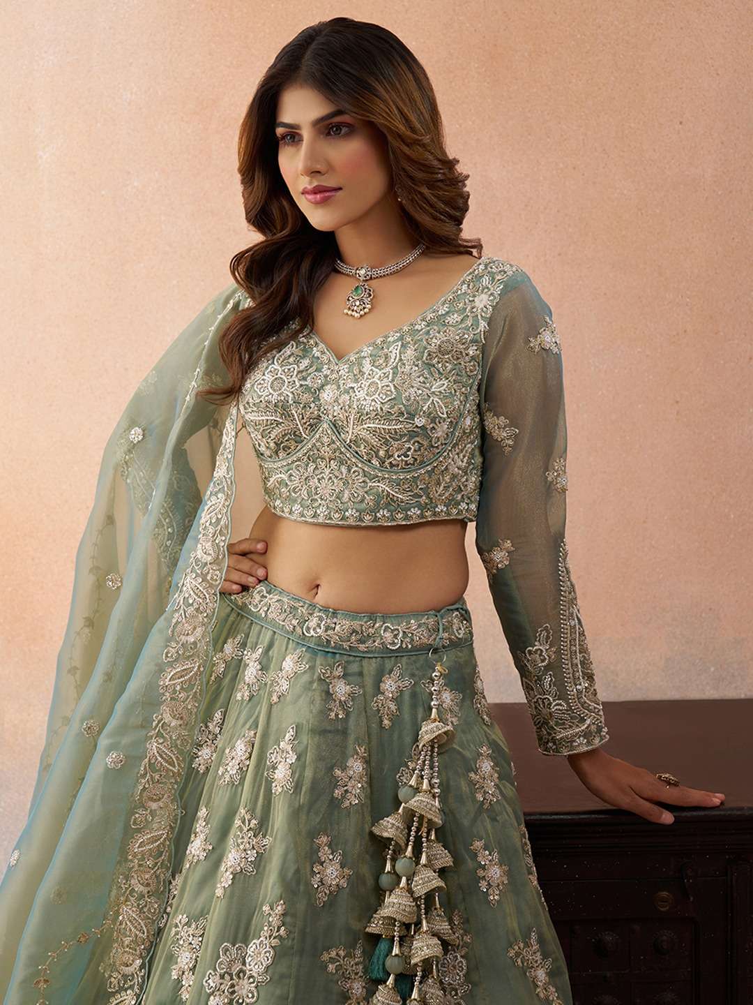 🎀 Extra Highlight Beautiful heavy latkan tassels attached to lehenga.