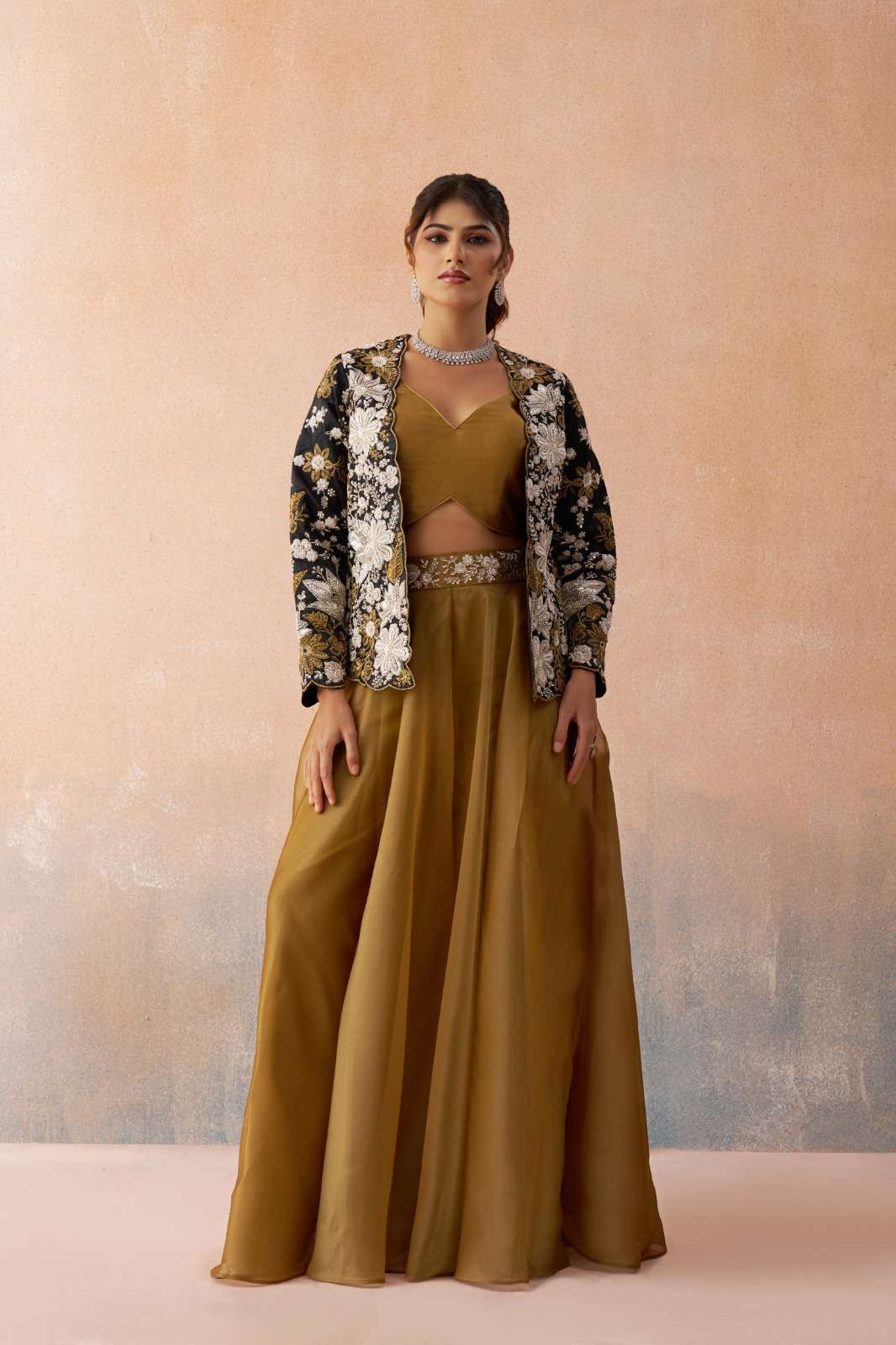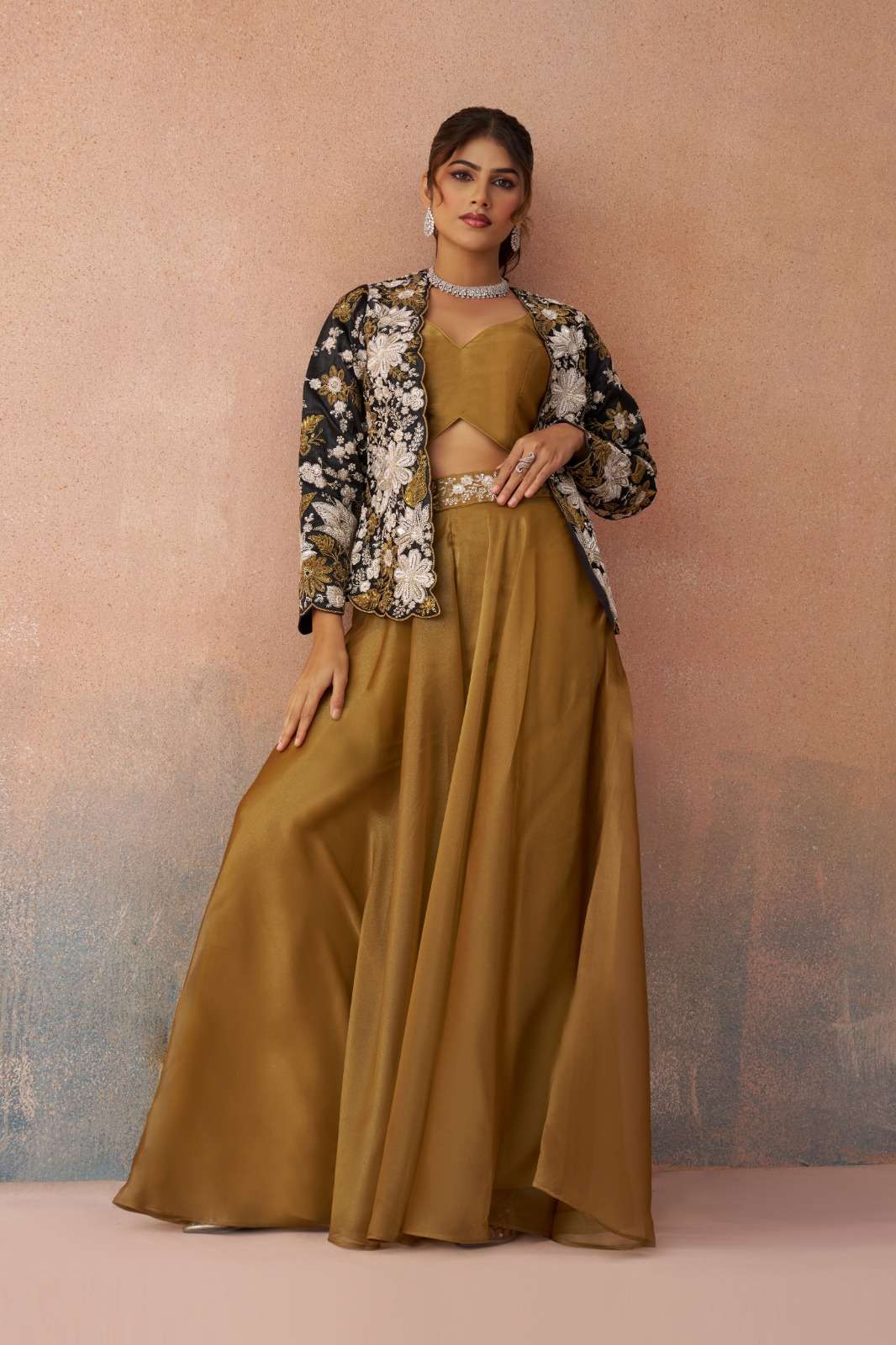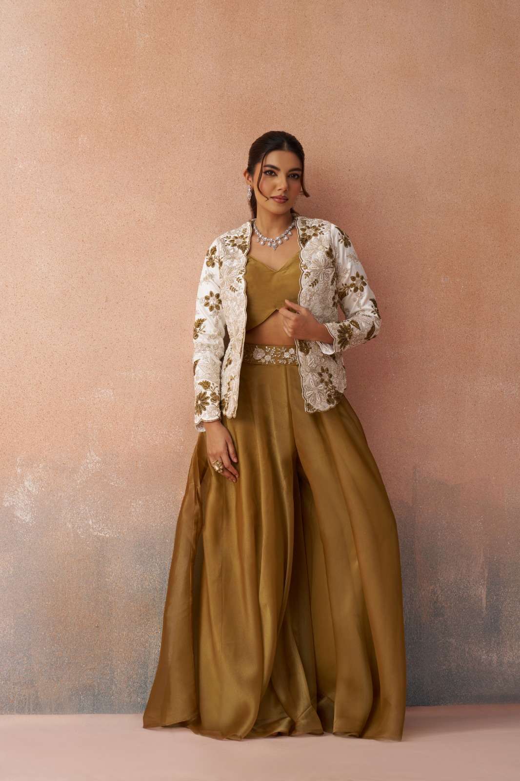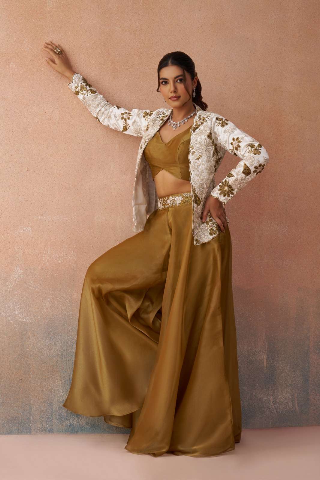 Category: Co-ord Set Product Name: Golden Mustard Tissue Floral Embroidered Crop Top with Jacket & Palazzo Set Gender: Women Occasion: Festive