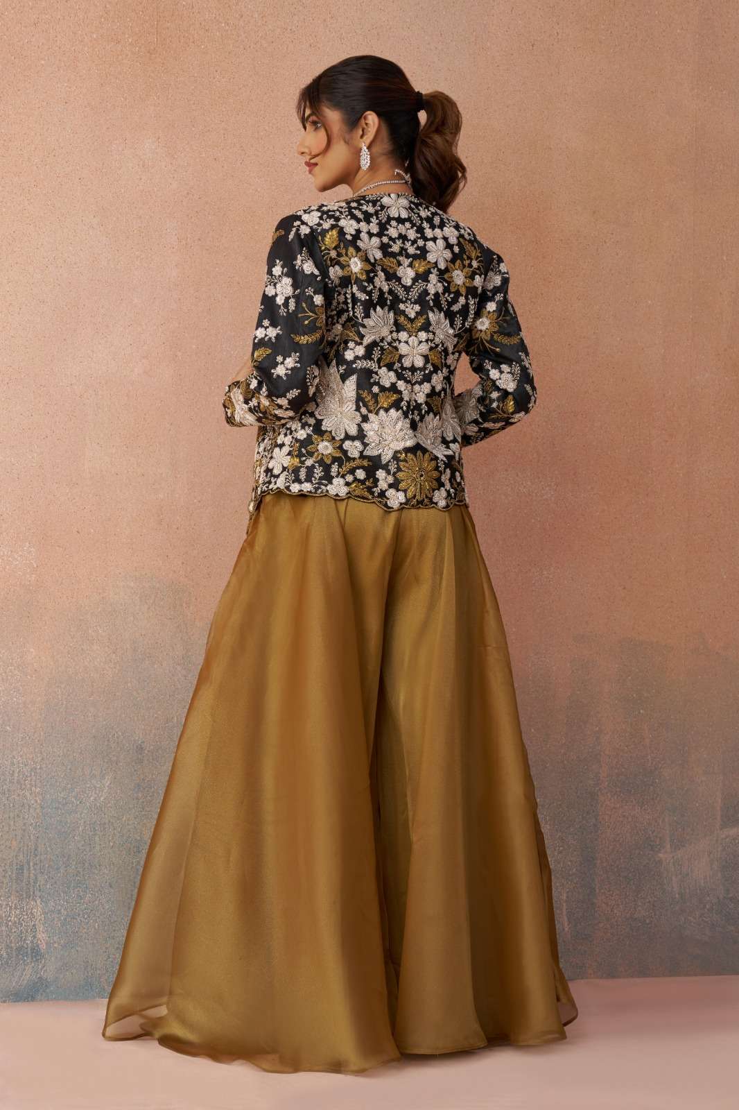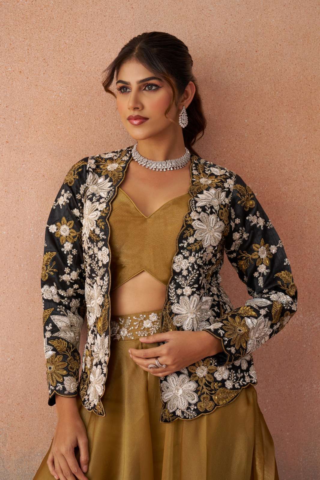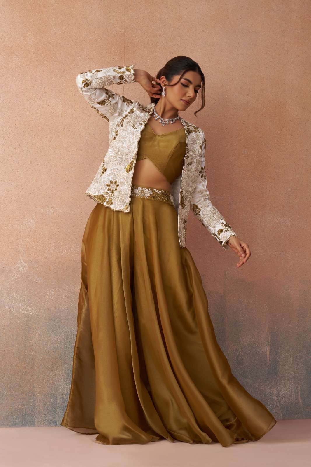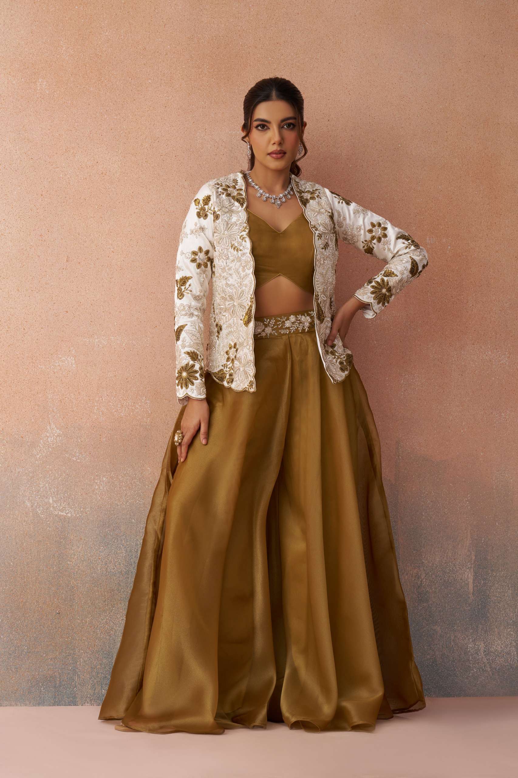 Category: Co-ord Set Product Name: Golden Mustard Tissue Floral Embroidered Crop Top with Jacket & Palazzo Set Gender: Women Occasion: Festive