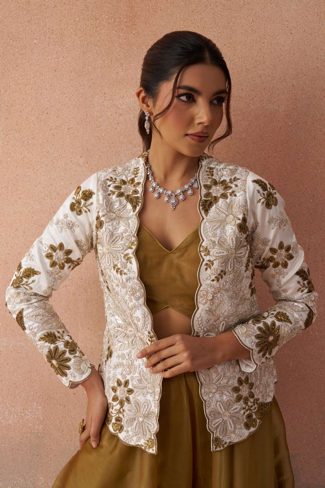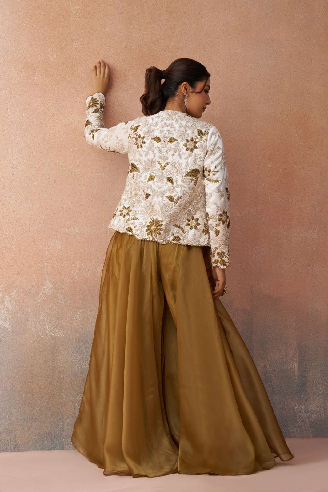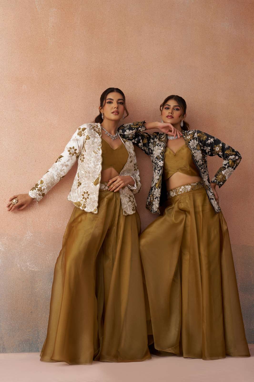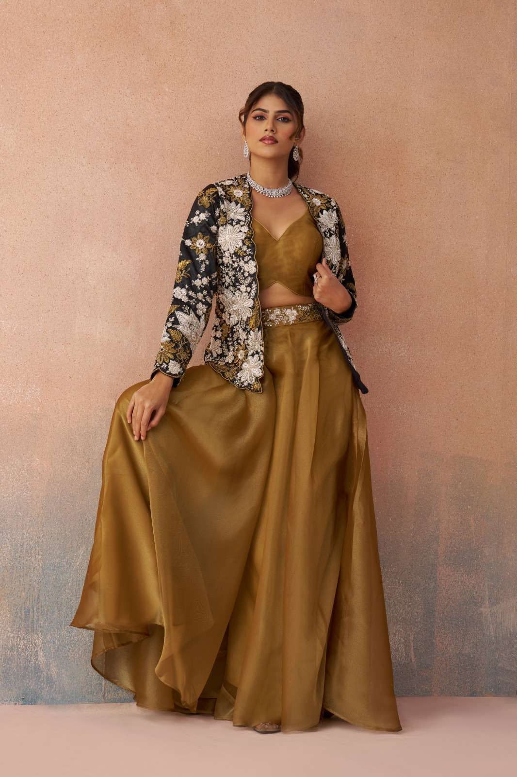 Category: Co-ord Set Product Name: Golden Mustard Tissue Floral Embroidered Crop Top with Jacket & Palazzo Set Gender: Women Occasion: Festive