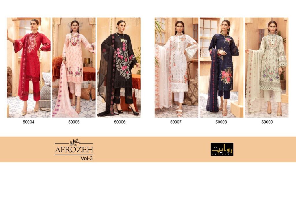 Buy Online Afrozeh Vol 3 By Collection 2021 By Rawayat Manufacturer Traders And Dealer From India 6 Pcs of Full Catalogue at Wholesale Price. Looking for Afrozeh Vol 3 By Collection 2021 By Rawayat Manufacturer Traders And Dealer From India Full Catalouge at Best Price? Buy Now Afrozeh Vol 3 By Collection 2021 By Rawayat Manufacturer Traders And Dealer From India at Wholesale Rate of Rs 7500 with Total 6 Pcs from authroized dealer and supplier of Brand. Cost of Each piece is just only Rs 1250 which is very low and affordable price to resale the product in your retail store ,This is Surat based Wholesale Supplier & Dealer of Brand. Click on Brand name to Know more about Brand's products.Call or Whatsapp on 9898838984 for booking or enquiry