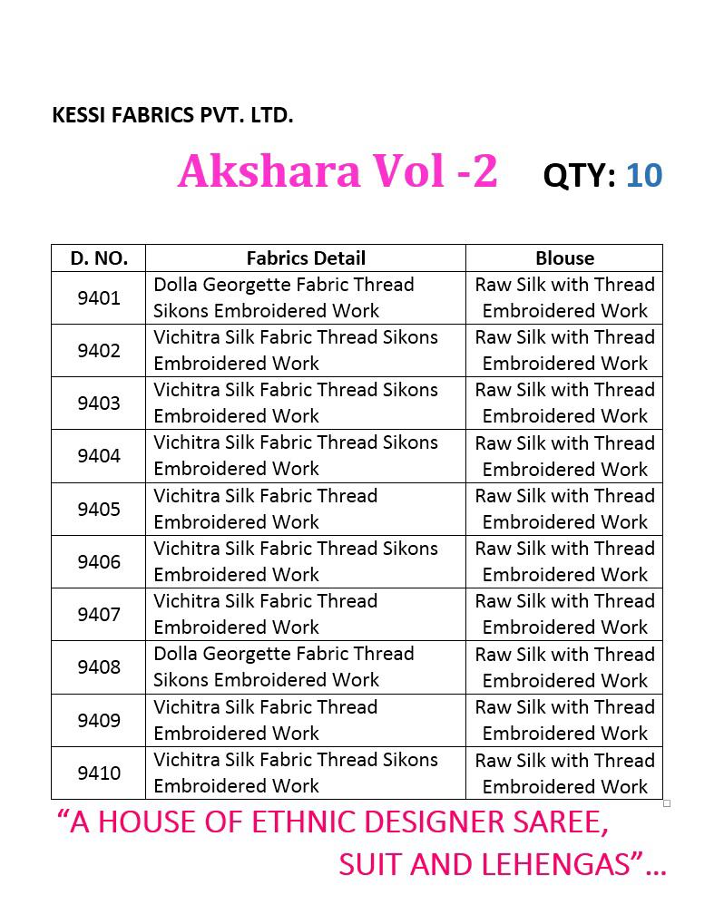 Buy Online Akshara Vol 2 By Kessi Series 9401 To 9410 Silk Designer Party Wear Sarees Wholesale Supplier And Dealer Gujarat 10 Pcs of Full Catalogue at Wholesale Price. Looking for Akshara Vol 2 By Kessi Series 9401 To 9410 Silk Designer Party Wear Sarees Wholesale Supplier And Dealer Gujarat Full Catalouge at Best Price? Buy Now Akshara Vol 2 By Kessi Series 9401 To 9410 Silk Designer Party Wear Sarees Wholesale Supplier And Dealer Gujarat at Wholesale Rate of Rs 11990 with Total 10 Pcs from authroized dealer and supplier of KESSI Brand. Cost of Each piece is just only Rs 1199 which is very low and affordable price to resale the product in your retail store ,This is Surat based Wholesale Supplier & Dealer of KESSI Brand. Click on Brand name to Know more about KESSI Brand's products.Call or Whatsapp on 9898838984 for booking or enquiry