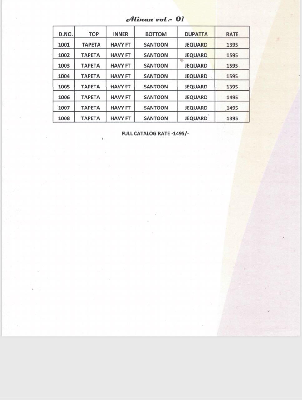 Buy Online Alinaa Vol 1 By Tarrah Series 1001 To 1008 Ready To Wear Designer Party Wear Gowns Catalog Wholesale Supplier And Dealer Gujarat 8 Pcs of Full Catalogue at Wholesale Price. Looking for Alinaa Vol 1 By Tarrah Series 1001 To 1008 Ready To Wear Designer Party Wear Gowns Catalog Wholesale Supplier And Dealer Gujarat Full Catalouge at Best Price? Buy Now Alinaa Vol 1 By Tarrah Series 1001 To 1008 Ready To Wear Designer Party Wear Gowns Catalog Wholesale Supplier And Dealer Gujarat at Wholesale Rate of Rs 11960 with Total 8 Pcs from authroized dealer and supplier of BRAND'S Brand. Cost of Each piece is just only Rs 1495 which is very low and affordable price to resale the product in your retail store ,This is Surat based Wholesale Supplier & Dealer of BRAND'S Brand. Click on Brand name to Know more about BRAND'S Brand's products.Call or Whatsapp on 9898838984 for booking or enquiry