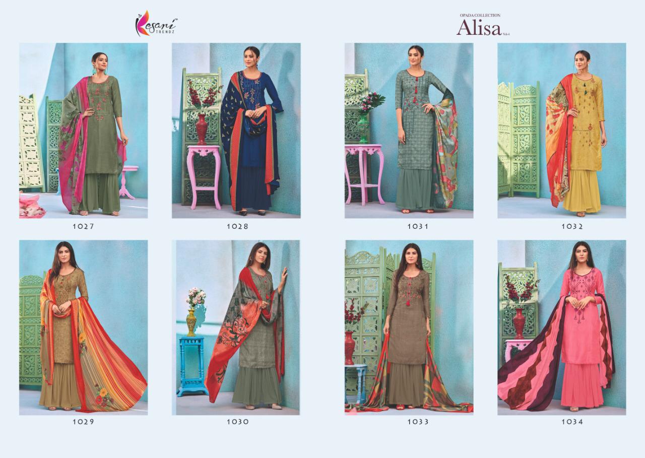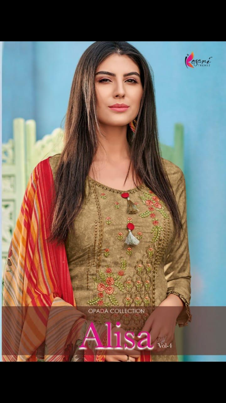 Buy Online Alisa Vol 4 By Kesari Trendz 1027 Series Fancy Party Wear Opada Silk Salwar Kameez Catlog Wholesaler Surat 8 Pcs of Full Catalogue at Wholesale Price. Looking for Alisa Vol 4 By Kesari Trendz 1027 Series Fancy Party Wear Opada Silk Salwar Kameez Catlog Wholesaler Surat Full Catalouge at Best Price? Buy Now Alisa Vol 4 By Kesari Trendz 1027 Series Fancy Party Wear Opada Silk Salwar Kameez Catlog Wholesaler Surat at Wholesale Rate of Rs 5120 with Total 8 Pcs from authroized dealer and supplier of KESARI TRENDZ Brand. Cost of Each piece is just only Rs 640 which is very low and affordable price to resale the product in your retail store ,This is Surat based Wholesale Supplier & Dealer of KESARI TRENDZ Brand. Click on Brand name to Know more about KESARI TRENDZ Brand's products.Call or Whatsapp on 9898838984 for booking or enquiry