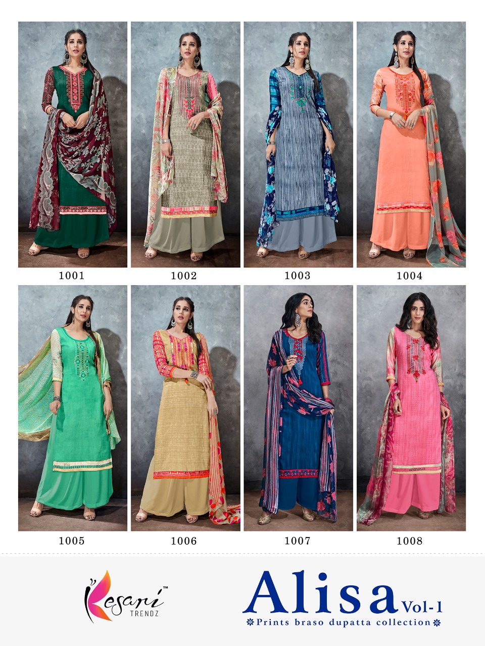 Buy Online Alisha Vol 1 By Kesari Trendz Surat Wholesale Supplier 8 Pcs of Full Catalogue at Wholesale Price. Looking for Alisha Vol 1 By Kesari Trendz Surat Wholesale Supplier Full Catalouge at Best Price? Buy Now Alisha Vol 1 By Kesari Trendz Surat Wholesale Supplier at Wholesale Rate of Rs 5560 with Total 8 Pcs from authroized dealer and supplier of KESARI TRENDZ Brand. Cost of Each piece is just only Rs 695 which is very low and affordable price to resale the product in your retail store ,This is Surat based Wholesale Supplier & Dealer of KESARI TRENDZ Brand. Click on Brand name to Know more about KESARI TRENDZ Brand's products.Call or Whatsapp on 9898838984 for booking or enquiry