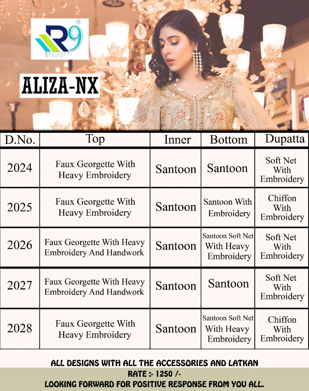 Buy Online Aliza Nx By R9 Pakistani Suits Wholesale Supplier Gujarat 5 Pcs of Full Catalogue at Wholesale Price. Looking for Aliza Nx By R9 Pakistani Suits Wholesale Supplier Gujarat Full Catalouge at Best Price? Buy Now Aliza Nx By R9 Pakistani Suits Wholesale Supplier Gujarat at Wholesale Rate of Rs 6250 with Total 5 Pcs from authroized dealer and supplier of Brand. Cost of Each piece is just only Rs 1250 which is very low and affordable price to resale the product in your retail store ,This is Surat based Wholesale Supplier & Dealer of Brand. Click on Brand name to Know more about Brand's products.Call or Whatsapp on 9898838984 for booking or enquiry