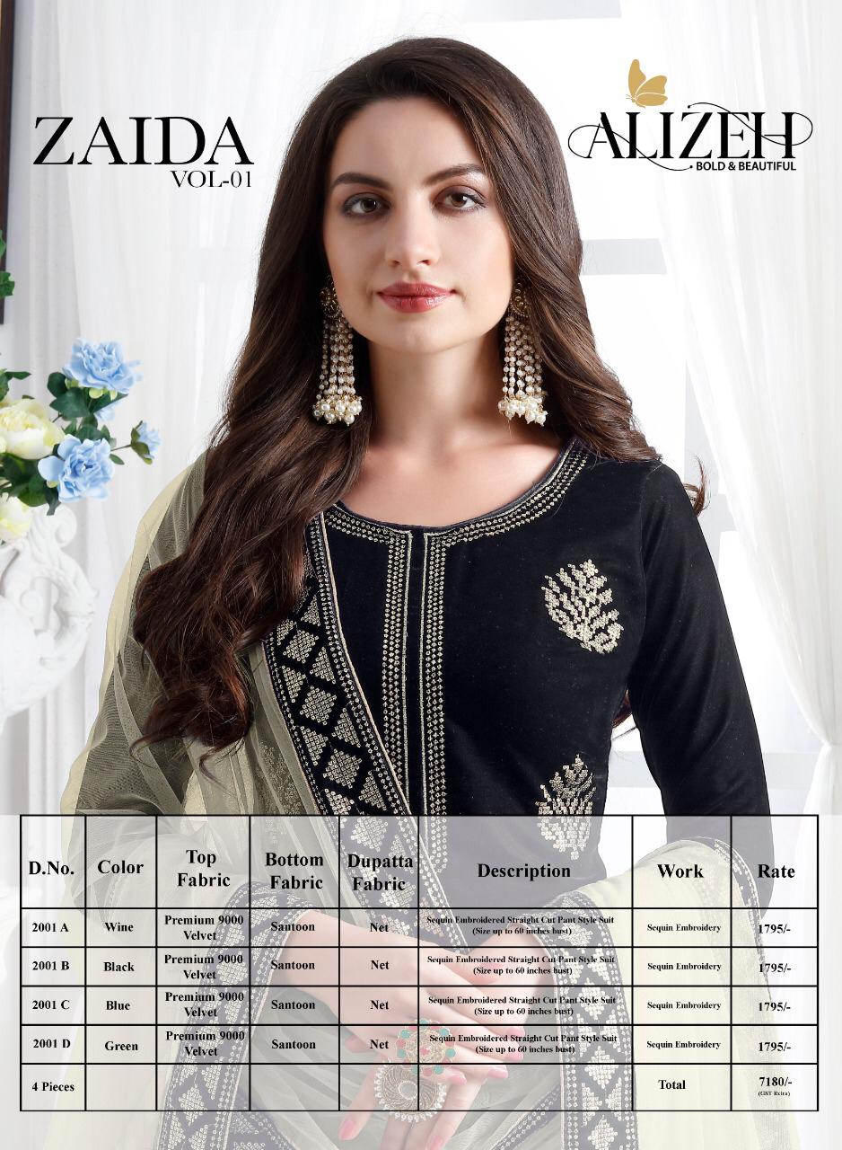 Buy Online Alizeh Official Zaida Vol 1 Series 2001 A Designer Party Wear Suits Wholesale Supplier Gujarat 4 Pcs of Full Catalogue at Wholesale Price. Looking for Alizeh Official Zaida Vol 1 Series 2001 A Designer Party Wear Suits Wholesale Supplier Gujarat Full Catalouge at Best Price? Buy Now Alizeh Official Zaida Vol 1 Series 2001 A Designer Party Wear Suits Wholesale Supplier Gujarat at Wholesale Rate of Rs 7180 with Total 4 Pcs from authroized dealer and supplier of Brand. Cost of Each piece is just only Rs 1795 which is very low and affordable price to resale the product in your retail store ,This is Surat based Wholesale Supplier & Dealer of Brand. Click on Brand name to Know more about Brand's products.Call or Whatsapp on 9898838984 for booking or enquiry