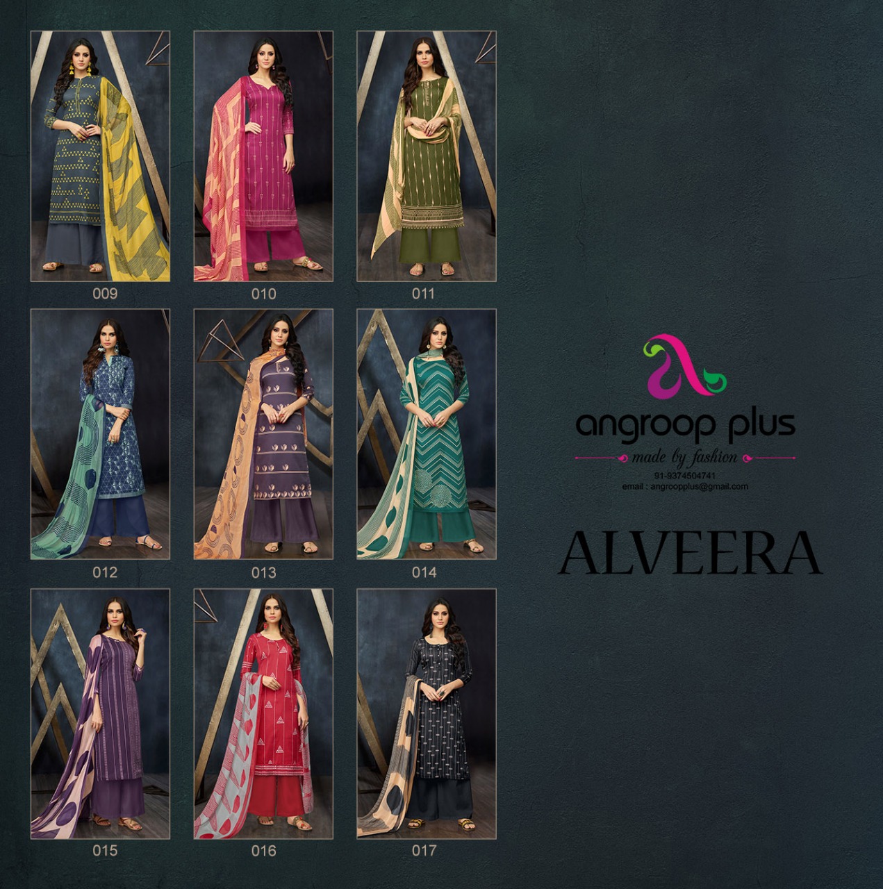 Buy Online Alveera By Angroop Plus 009 Series Pure Jam Silk Salwar Kameez Catlog Wholesale Supplier And Trader Surat 9 Pcs of Full Catalogue at Wholesale Price. Looking for Alveera By Angroop Plus 009 Series Pure Jam Silk Salwar Kameez Catlog Wholesale Supplier And Trader Surat Full Catalouge at Best Price? Buy Now Alveera By Angroop Plus 009 Series Pure Jam Silk Salwar Kameez Catlog Wholesale Supplier And Trader Surat at Wholesale Rate of Rs 5391 with Total 9 Pcs from authroized dealer and supplier of ANGROOP PLUS Brand. Cost of Each piece is just only Rs 599 which is very low and affordable price to resale the product in your retail store ,This is Surat based Wholesale Supplier & Dealer of ANGROOP PLUS Brand. Click on Brand name to Know more about ANGROOP PLUS Brand's products.Call or Whatsapp on 9898838984 for booking or enquiry