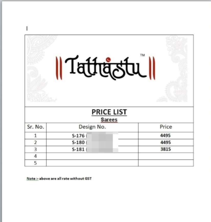Buy Online Anaara 176 180 181 by Tathastu saree Collection manufacturer surat 5 Pcs of Full Catalogue at Wholesale Price. Looking for Anaara 176 180 181 by Tathastu saree Collection manufacturer surat Full Catalouge at Best Price? Buy Now Anaara 176 180 181 by Tathastu saree Collection manufacturer surat at Wholesale Rate of Rs 0 with Total 5 Pcs from authroized dealer and supplier of TATHASTU Brand. Cost of Each piece is just only Rs 0 which is very low and affordable price to resale the product in your retail store ,This is Surat based Wholesale Supplier & Dealer of TATHASTU Brand. Click on Brand name to Know more about TATHASTU Brand's products.Call or Whatsapp on 9898838984 for booking or enquiry