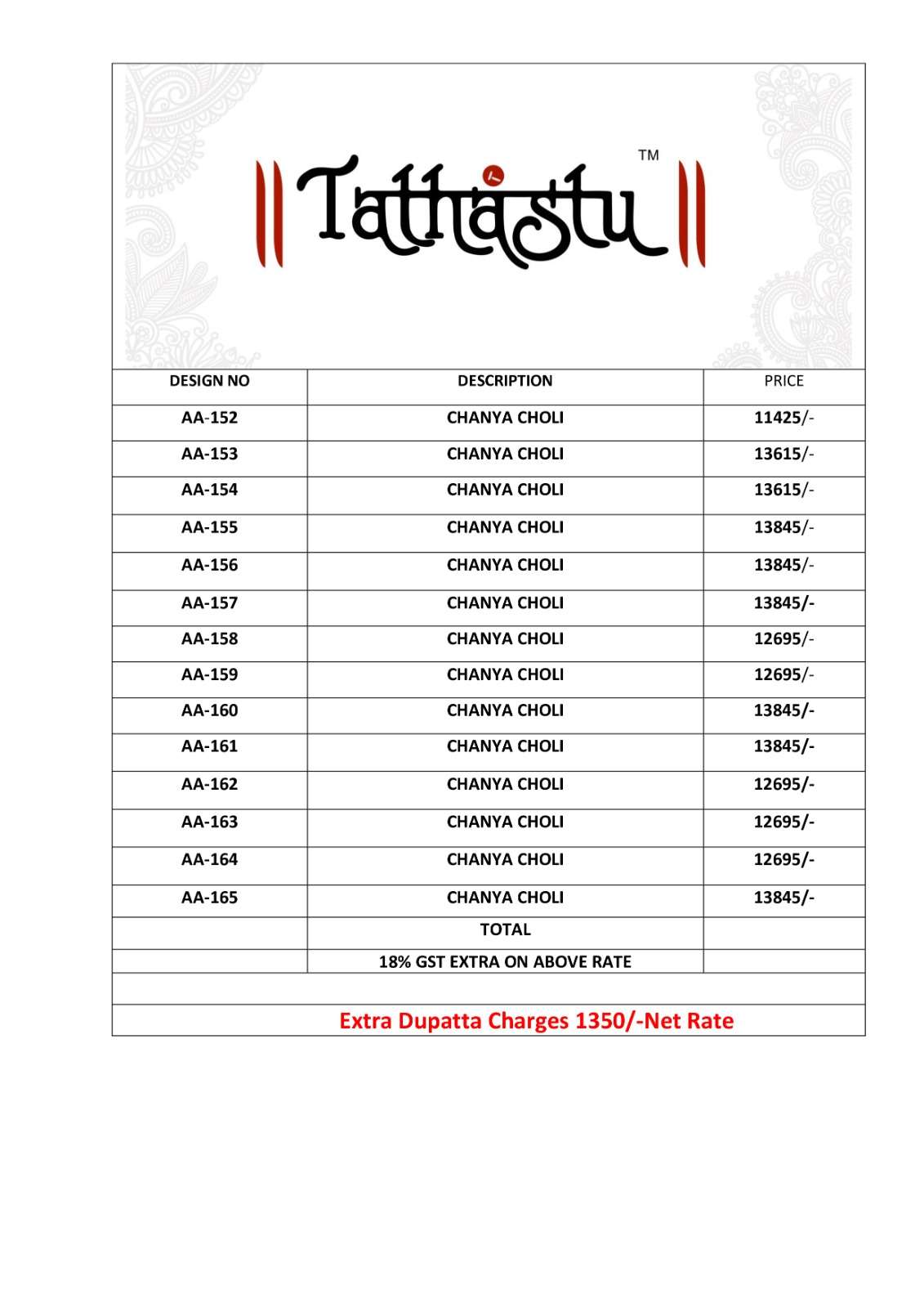 Buy Online ANAARA BRIDAL WEAR 152 TO 165 by TATHASTU lehenga choli collection manufacturers surat 15 Pcs of Full Catalogue at Wholesale Price. Looking for ANAARA BRIDAL WEAR 152 TO 165 by TATHASTU lehenga choli collection manufacturers surat Full Catalouge at Best Price? Buy Now ANAARA BRIDAL WEAR 152 TO 165 by TATHASTU lehenga choli collection manufacturers surat at Wholesale Rate of Rs 0 with Total 15 Pcs from authroized dealer and supplier of TATHASTU Brand. Cost of Each piece is just only Rs 0 which is very low and affordable price to resale the product in your retail store ,This is Surat based Wholesale Supplier & Dealer of TATHASTU Brand. Click on Brand name to Know more about TATHASTU Brand's products.Call or Whatsapp on 9898838984 for booking or enquiry