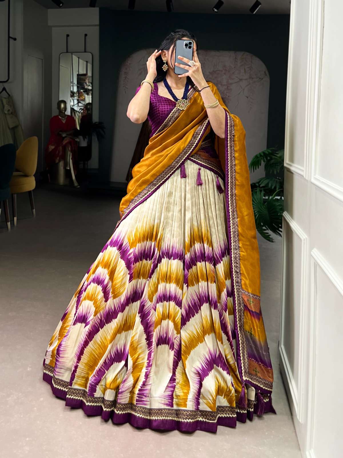 *Lehenga (Stitched)* Lehenga Fabric : Tasar Silk Lehenga Work : Tie And Dye Print With Lace Touch Up Lehenga Waist : Support Up To 42 Lehenga Closer : Drawstring With Zip Stitching : Stitched With Canvas And Can-can Length : 41 Flair : 3.80 Meter Inner : Micro Crepe