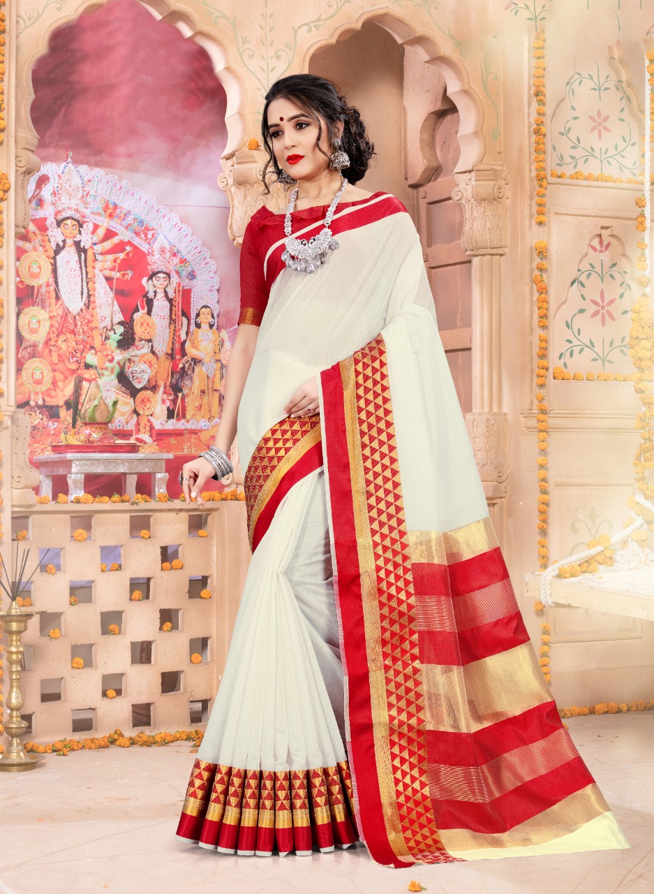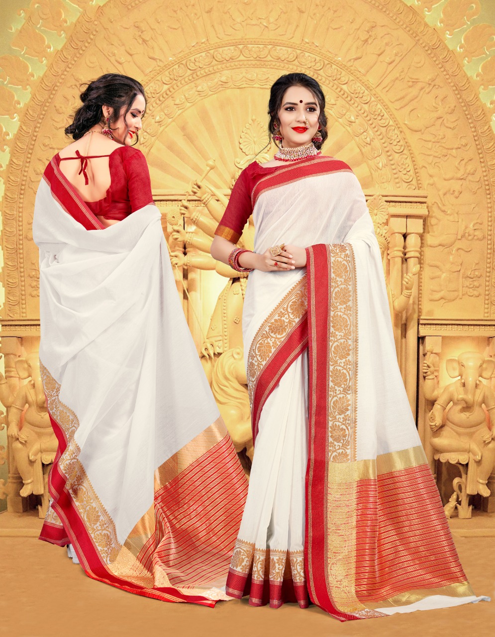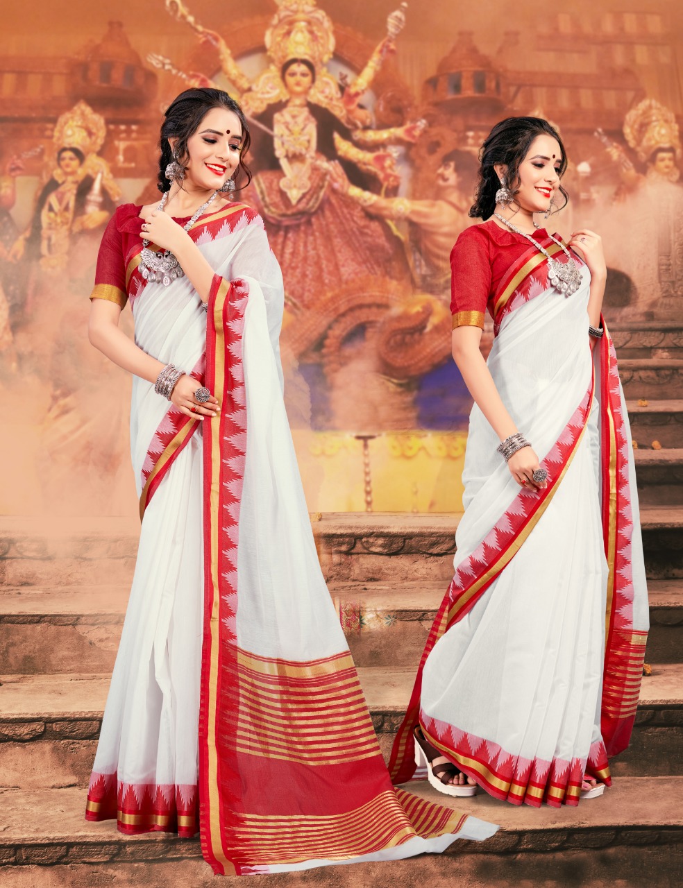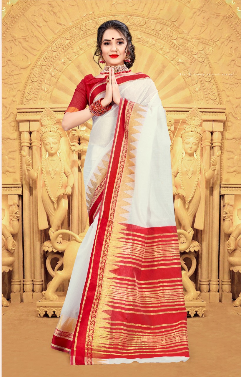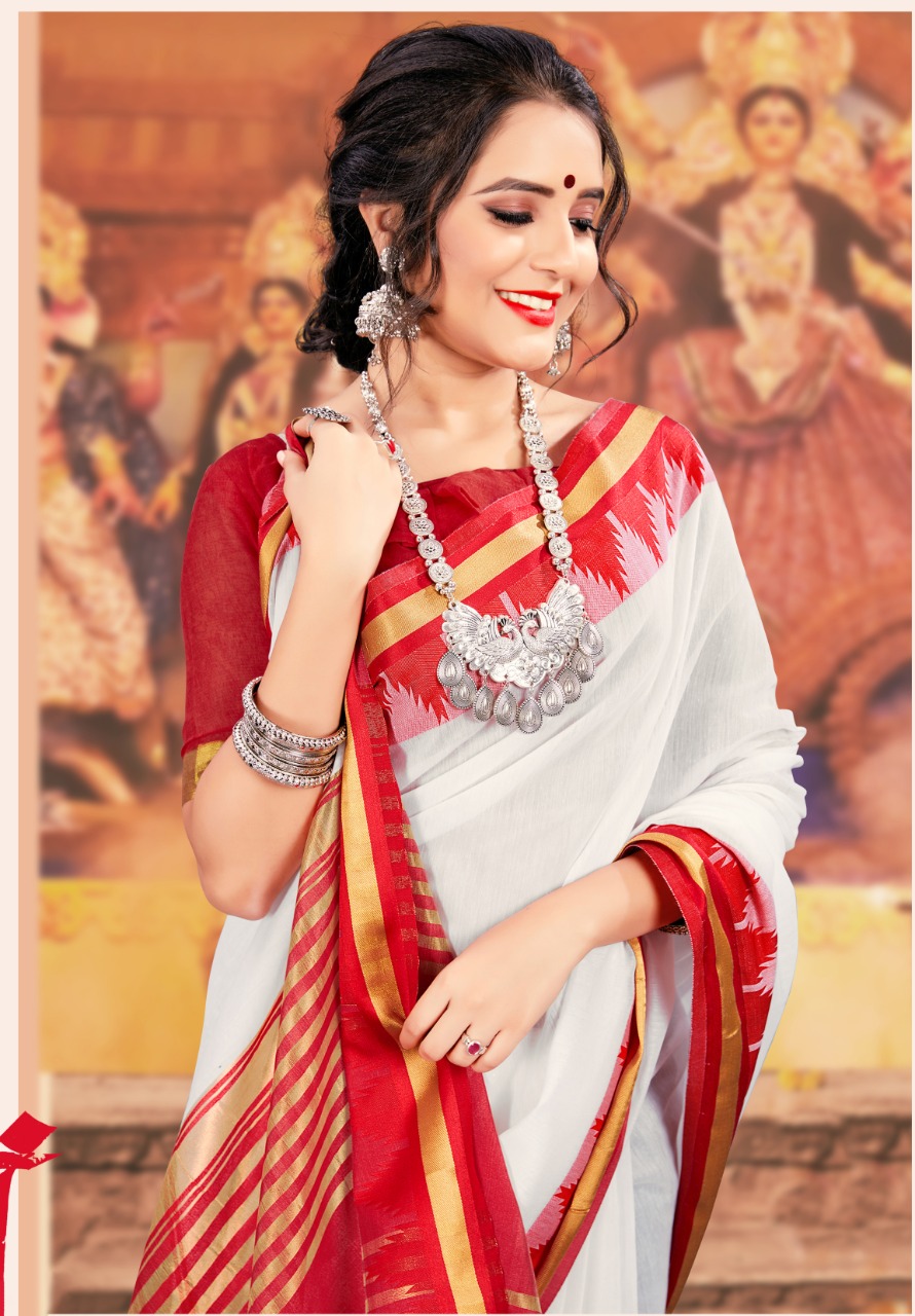 CATALOG: *ANANDI* FABRIC: KHADI SILK HANDLOOM Full set RATE: 665+5%GST Single 795+5% gst AVAILABLE WITH BLOUSE PIECE ATTACHED ?*BOOK YOUR ORDERS NOW*? *White and red saree collection* |