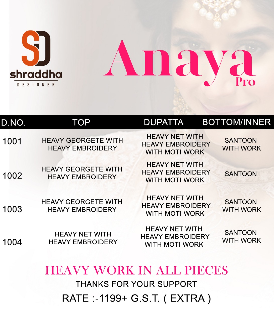 Buy Online Anaya Pro By Shraddha Designer Series 1001 To 1004georgette Embroidered Designer Party Wear Pakistani Suits Wholesale Supplier Surat 4 Pcs of Full Catalogue at Wholesale Price. Looking for Anaya Pro By Shraddha Designer Series 1001 To 1004georgette Embroidered Designer Party Wear Pakistani Suits Wholesale Supplier Surat Full Catalouge at Best Price? Buy Now Anaya Pro By Shraddha Designer Series 1001 To 1004georgette Embroidered Designer Party Wear Pakistani Suits Wholesale Supplier Surat at Wholesale Rate of Rs 4796 with Total 4 Pcs from authroized dealer and supplier of Shraddha designer Brand. Cost of Each piece is just only Rs 1199 which is very low and affordable price to resale the product in your retail store ,This is Surat based Wholesale Supplier & Dealer of Shraddha designer Brand. Click on Brand name to Know more about Shraddha designer Brand's products.Call or Whatsapp on 9898838984 for booking or enquiry
