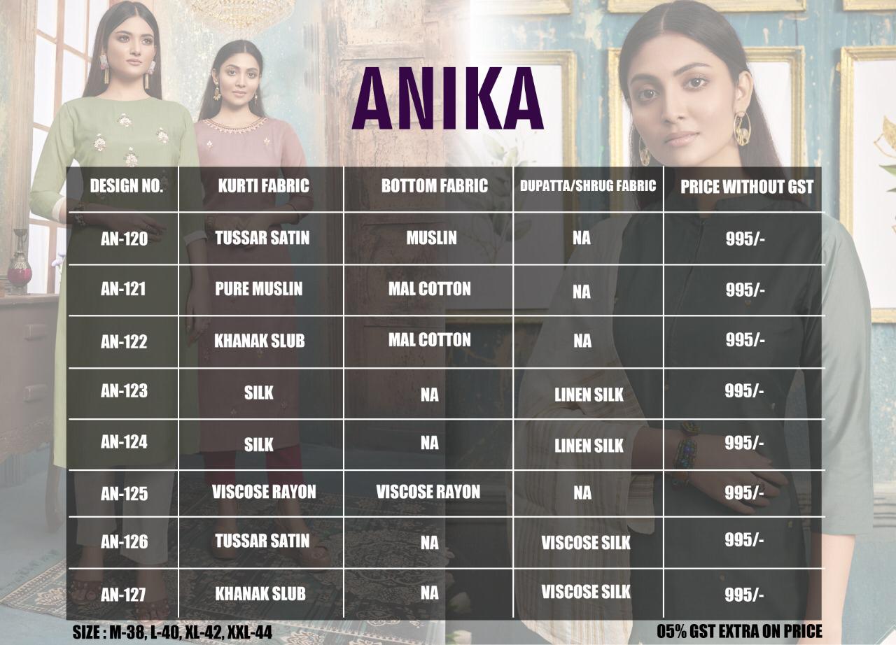 Buy Online Anika By Anyuka Kurtis With Bottom And Duppta Wholesale Supplier And Dealer Surat 8 Pcs of Full Catalogue at Wholesale Price. Looking for Anika By Anyuka Kurtis With Bottom And Duppta Wholesale Supplier And Dealer Surat Full Catalouge at Best Price? Buy Now Anika By Anyuka Kurtis With Bottom And Duppta Wholesale Supplier And Dealer Surat at Wholesale Rate of Rs 7960 with Total 8 Pcs from authroized dealer and supplier of Brand. Cost of Each piece is just only Rs 995 which is very low and affordable price to resale the product in your retail store ,This is Surat based Wholesale Supplier & Dealer of Brand. Click on Brand name to Know more about Brand's products.Call or Whatsapp on 9898838984 for booking or enquiry
