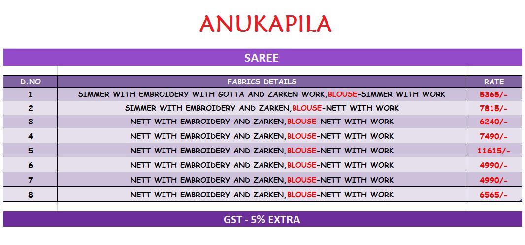 Brand - ANUKAPILA . Type - Saree. D No - 1 To 8. No catlog book . Per Pcs photo. * set & loose & singel * Single extra 100 GST 5 Percent Extra. Delivery from today |