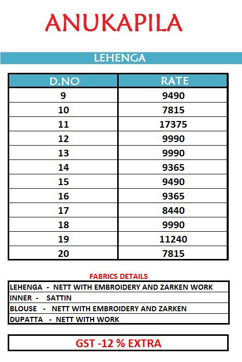 Buy Online Anukapila Series 9 To 20 Designer Party Wear Lehngas Wholesale Supplier Gujarat 0 Pcs of Full Catalogue at Wholesale Price. Looking for Anukapila Series 9 To 20 Designer Party Wear Lehngas Wholesale Supplier Gujarat Full Catalouge at Best Price? Buy Now Anukapila Series 9 To 20 Designer Party Wear Lehngas Wholesale Supplier Gujarat at Wholesale Rate of Rs 0 with Total 0 Pcs from authroized dealer and supplier of Brand. Cost of Each piece is just only Rs 0 which is very low and affordable price to resale the product in your retail store ,This is Surat based Wholesale Supplier & Dealer of Brand. Click on Brand name to Know more about Brand's products.Call or Whatsapp on 9898838984 for booking or enquiry