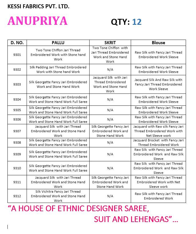 Buy Online Anupriya By Kessi 9301 Series Fancy Party Wear Saree Collection Wholesaler Surat 12 Pcs of Full Catalogue at Wholesale Price. Looking for Anupriya By Kessi 9301 Series Fancy Party Wear Saree Collection Wholesaler Surat Full Catalouge at Best Price? Buy Now Anupriya By Kessi 9301 Series Fancy Party Wear Saree Collection Wholesaler Surat at Wholesale Rate of Rs 16788 with Total 12 Pcs from authroized dealer and supplier of KESSI Brand. Cost of Each piece is just only Rs 1399 which is very low and affordable price to resale the product in your retail store ,This is Surat based Wholesale Supplier & Dealer of KESSI Brand. Click on Brand name to Know more about KESSI Brand's products.Call or Whatsapp on 9898838984 for booking or enquiry