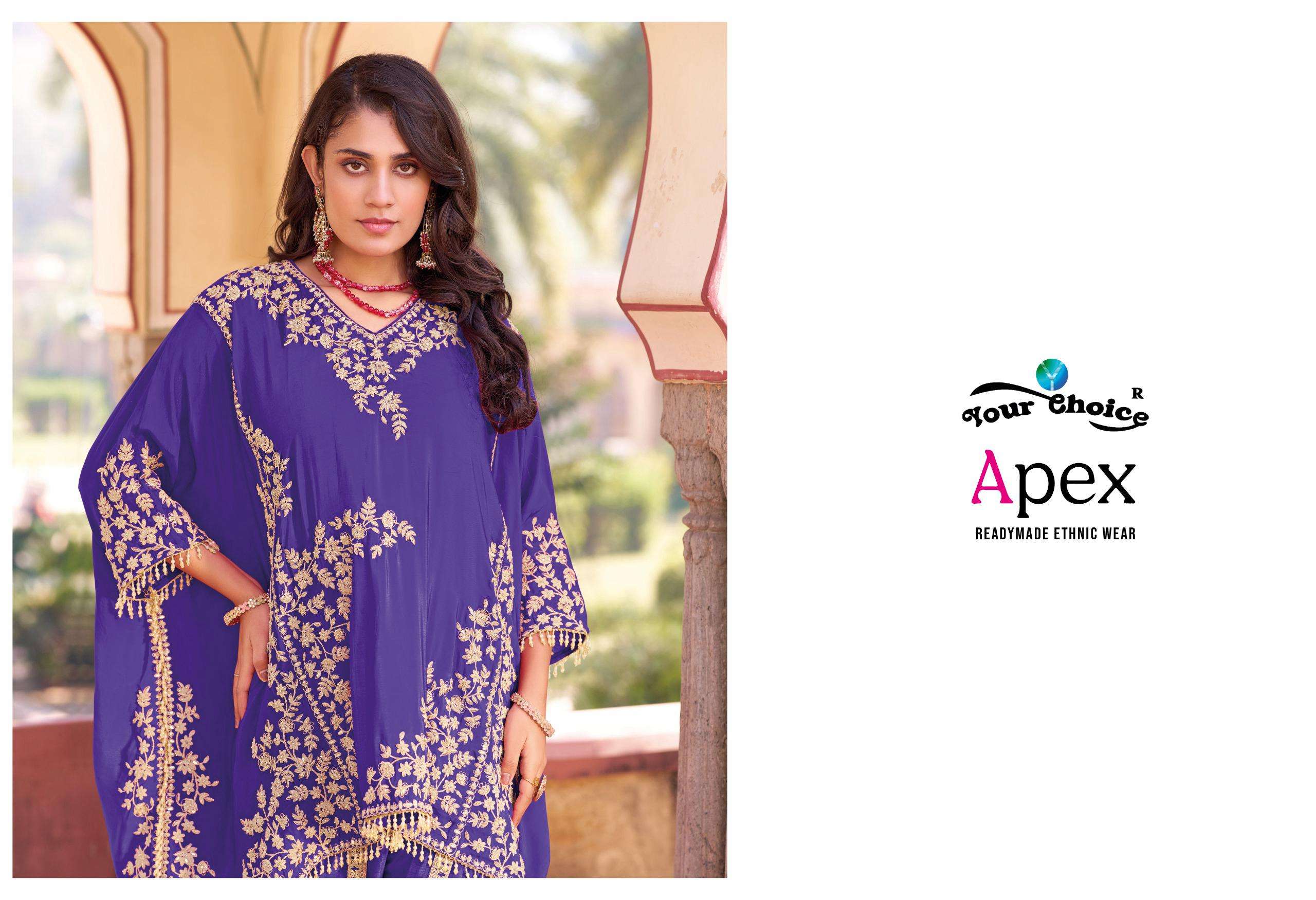 Buy Online APEX kaftan by Your choice heavy Chinon suit collection manufacturer surat 3 Pcs of Full Catalogue at Wholesale Price. Looking for APEX kaftan by Your choice heavy Chinon suit collection manufacturer surat Full Catalouge at Best Price? Buy Now APEX kaftan by Your choice heavy Chinon suit collection manufacturer surat at Wholesale Rate of Rs 5997 with Total 3 Pcs from authroized dealer and supplier of YOUR CHOICE Brand. Cost of Each piece is just only Rs 1999 which is very low and affordable price to resale the product in your retail store ,This is Surat based Wholesale Supplier & Dealer of YOUR CHOICE Brand. Click on Brand name to Know more about YOUR CHOICE Brand's products.Call or Whatsapp on 9898838984 for booking or enquiry