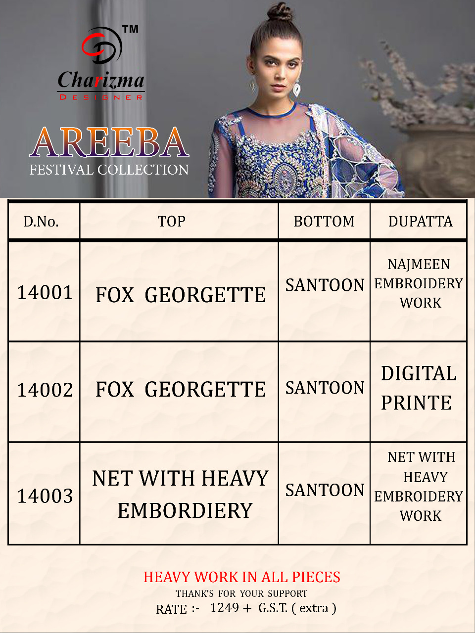 Buy Online Areeba By Charizma Designer Pakistani Suits Wholesale Supplier Surat 3 Pcs of Full Catalogue at Wholesale Price. Looking for Areeba By Charizma Designer Pakistani Suits Wholesale Supplier Surat Full Catalouge at Best Price? Buy Now Areeba By Charizma Designer Pakistani Suits Wholesale Supplier Surat at Wholesale Rate of Rs 3747 with Total 3 Pcs from authroized dealer and supplier of Brand. Cost of Each piece is just only Rs 1249 which is very low and affordable price to resale the product in your retail store ,This is Surat based Wholesale Supplier & Dealer of Brand. Click on Brand name to Know more about Brand's products.Call or Whatsapp on 9898838984 for booking or enquiry