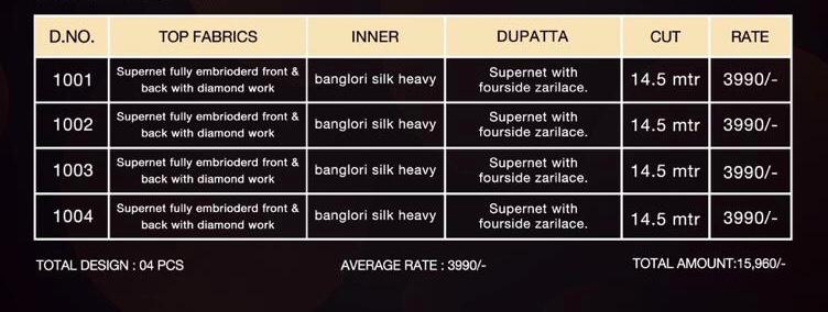 Buy Online Aroos Vol 6 By Rama Fashion Series 1001 To 1004 Designer Occasion Wear Suits Wholesale Supplier 4 Pcs of Full Catalogue at Wholesale Price. Looking for Aroos Vol 6 By Rama Fashion Series 1001 To 1004 Designer Occasion Wear Suits Wholesale Supplier Full Catalouge at Best Price? Buy Now Aroos Vol 6 By Rama Fashion Series 1001 To 1004 Designer Occasion Wear Suits Wholesale Supplier at Wholesale Rate of Rs 15960 with Total 4 Pcs from authroized dealer and supplier of RAMA FASHIONS Brand. Cost of Each piece is just only Rs 3990 which is very low and affordable price to resale the product in your retail store ,This is Surat based Wholesale Supplier & Dealer of RAMA FASHIONS Brand. Click on Brand name to Know more about RAMA FASHIONS Brand's products.Call or Whatsapp on 9898838984 for booking or enquiry