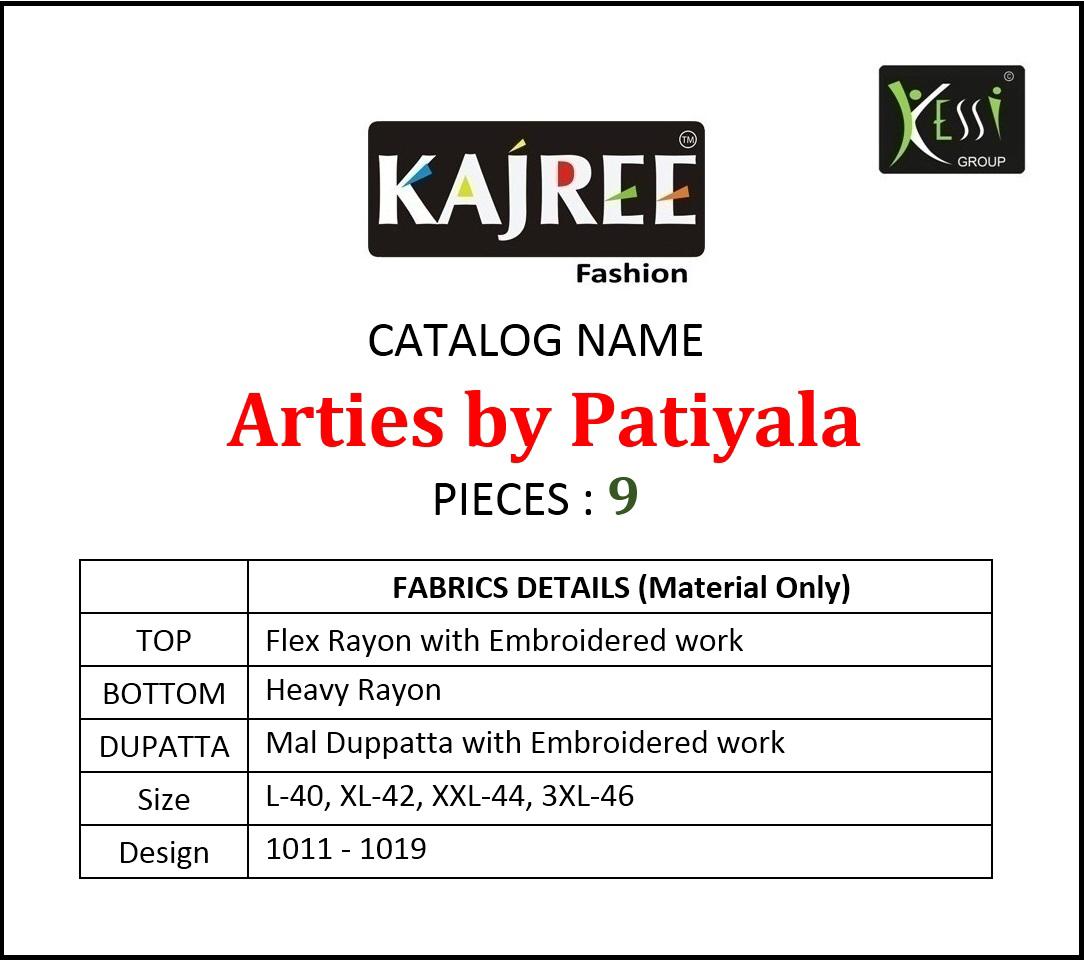 Buy Online Arties By Patiyala By Kajree 1011 Series Fancy Flex Reyon Patiala Suit Collection Wholesaler Surat 9 Pcs of Full Catalogue at Wholesale Price. Looking for Arties By Patiyala By Kajree 1011 Series Fancy Flex Reyon Patiala Suit Collection Wholesaler Surat Full Catalouge at Best Price? Buy Now Arties By Patiyala By Kajree 1011 Series Fancy Flex Reyon Patiala Suit Collection Wholesaler Surat at Wholesale Rate of Rs 7641 with Total 9 Pcs from authroized dealer and supplier of KESSI Brand. Cost of Each piece is just only Rs 849 which is very low and affordable price to resale the product in your retail store ,This is Surat based Wholesale Supplier & Dealer of KESSI Brand. Click on Brand name to Know more about KESSI Brand's products.Call or Whatsapp on 9898838984 for booking or enquiry