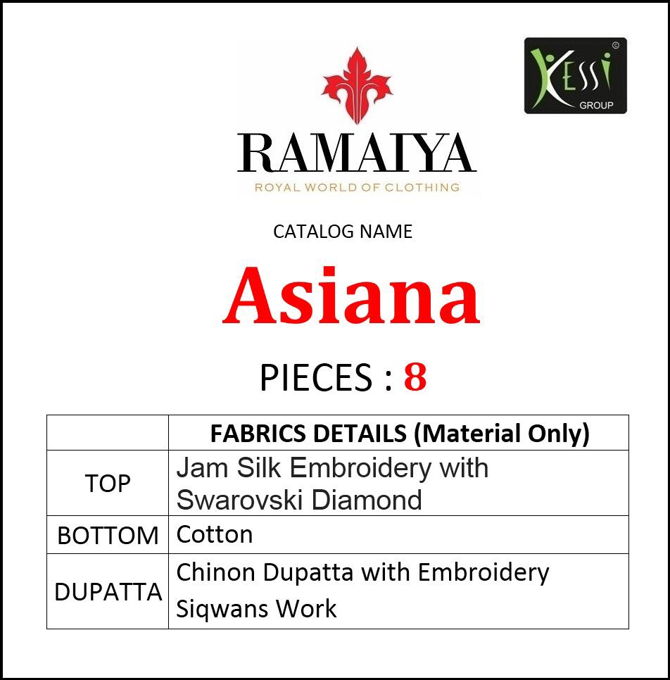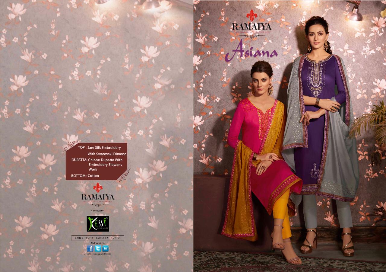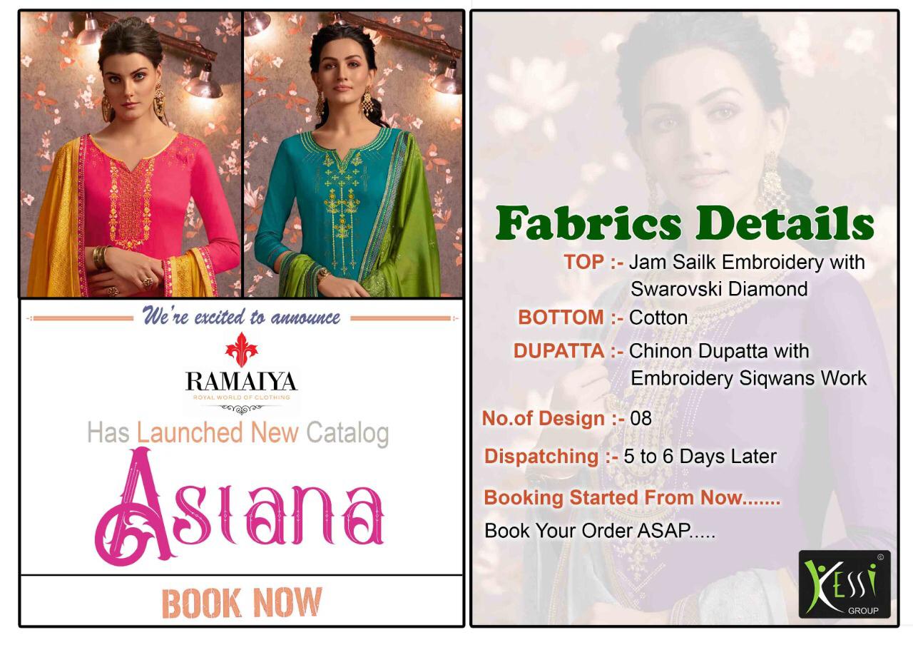 Buy Online Asiana By Ramaiya Jam Silk Dress Materials Wholesale Supplier India 8 Pcs of Full Catalogue at Wholesale Price. Looking for Asiana By Ramaiya Jam Silk Dress Materials Wholesale Supplier India Full Catalouge at Best Price? Buy Now Asiana By Ramaiya Jam Silk Dress Materials Wholesale Supplier India at Wholesale Rate of Rs 6392 with Total 8 Pcs from authroized dealer and supplier of Brand. Cost of Each piece is just only Rs 799 which is very low and affordable price to resale the product in your retail store ,This is Surat based Wholesale Supplier & Dealer of Brand. Click on Brand name to Know more about Brand's products.Call or Whatsapp on 9898838984 for booking or enquiry