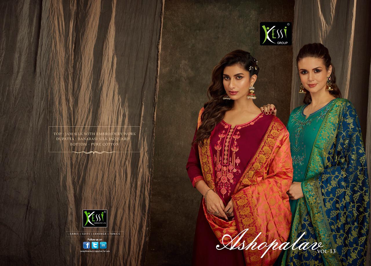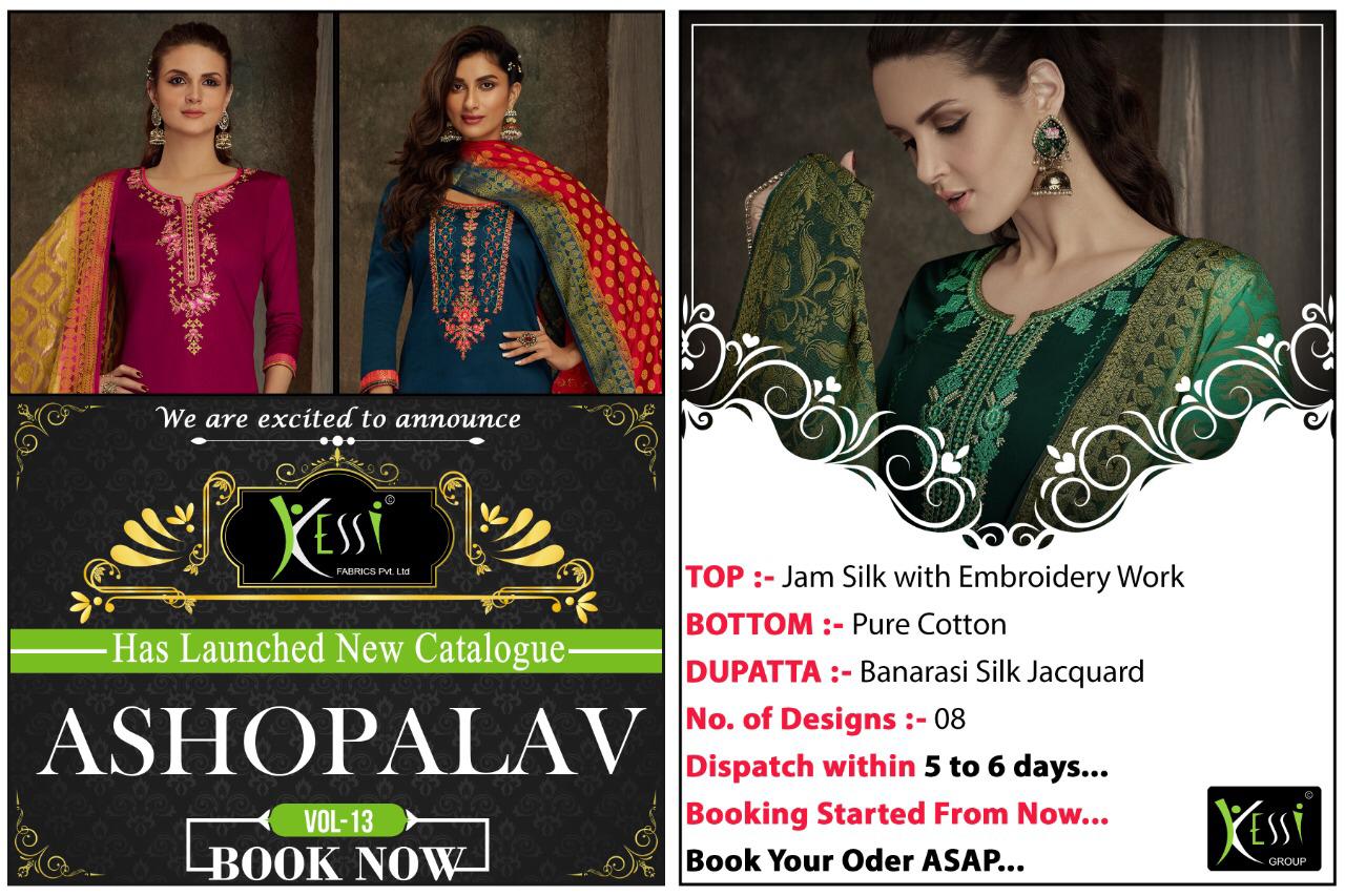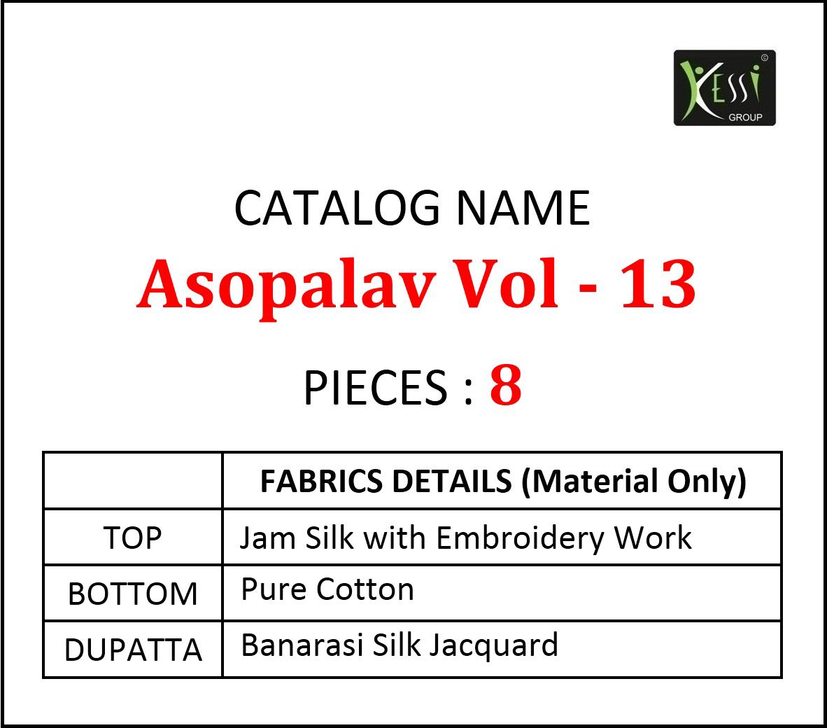 Buy Online Asopalav Vol 13 By Kessi Jam Silk Dress Materials Wholesale Supplier India 8 Pcs of Full Catalogue at Wholesale Price. Looking for Asopalav Vol 13 By Kessi Jam Silk Dress Materials Wholesale Supplier India Full Catalouge at Best Price? Buy Now Asopalav Vol 13 By Kessi Jam Silk Dress Materials Wholesale Supplier India at Wholesale Rate of Rs 7192 with Total 8 Pcs from authroized dealer and supplier of KESSI Brand. Cost of Each piece is just only Rs 899 which is very low and affordable price to resale the product in your retail store ,This is Surat based Wholesale Supplier & Dealer of KESSI Brand. Click on Brand name to Know more about KESSI Brand's products.Call or Whatsapp on 9898838984 for booking or enquiry
