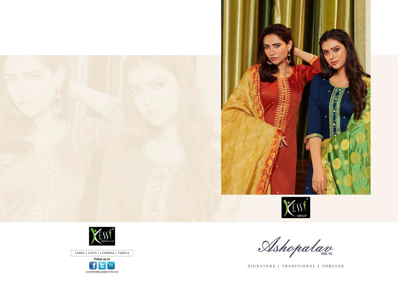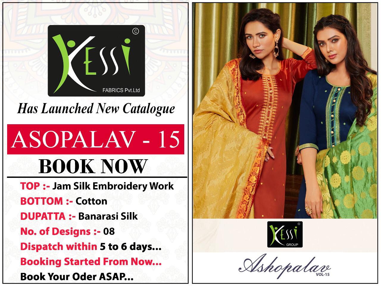Buy Online Asopalav Vol 15 By Kessi Designer Party Wear Suits Wholesale Supplier Gujarat 8 Pcs of Full Catalogue at Wholesale Price. Looking for Asopalav Vol 15 By Kessi Designer Party Wear Suits Wholesale Supplier Gujarat Full Catalouge at Best Price? Buy Now Asopalav Vol 15 By Kessi Designer Party Wear Suits Wholesale Supplier Gujarat at Wholesale Rate of Rs 7192 with Total 8 Pcs from authroized dealer and supplier of KESSI Brand. Cost of Each piece is just only Rs 899 which is very low and affordable price to resale the product in your retail store ,This is Surat based Wholesale Supplier & Dealer of KESSI Brand. Click on Brand name to Know more about KESSI Brand's products.Call or Whatsapp on 9898838984 for booking or enquiry