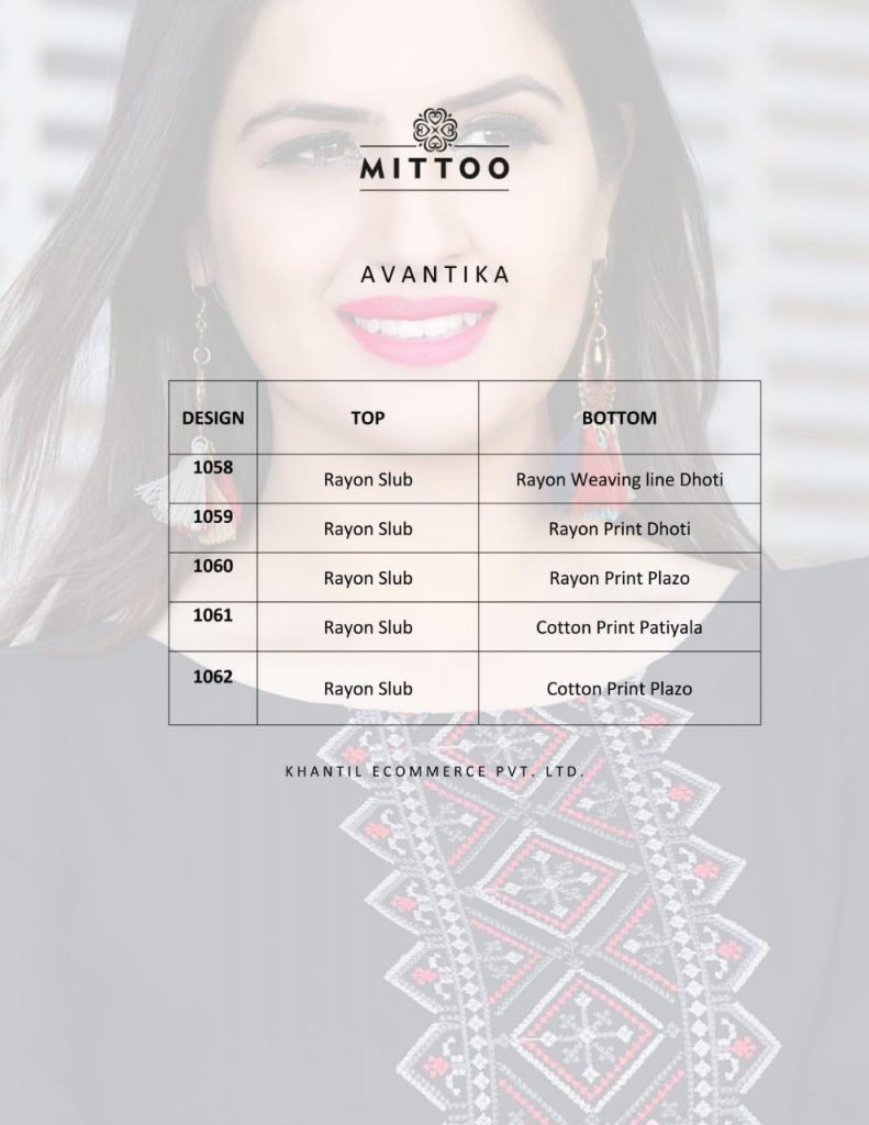 Brand Name : Mittoo Catalog : *Avantika* Design : 5 Fabric : Given in Image Size : M(38), L(40), XL(42), XXL(44), XXXL(46) Rate : *790 / Pic + 5% GST* Dispatch date : 2nd May, 2019 Set To Set. Selling price must be Rs 830 + 5% gst Regards Team Khantil |