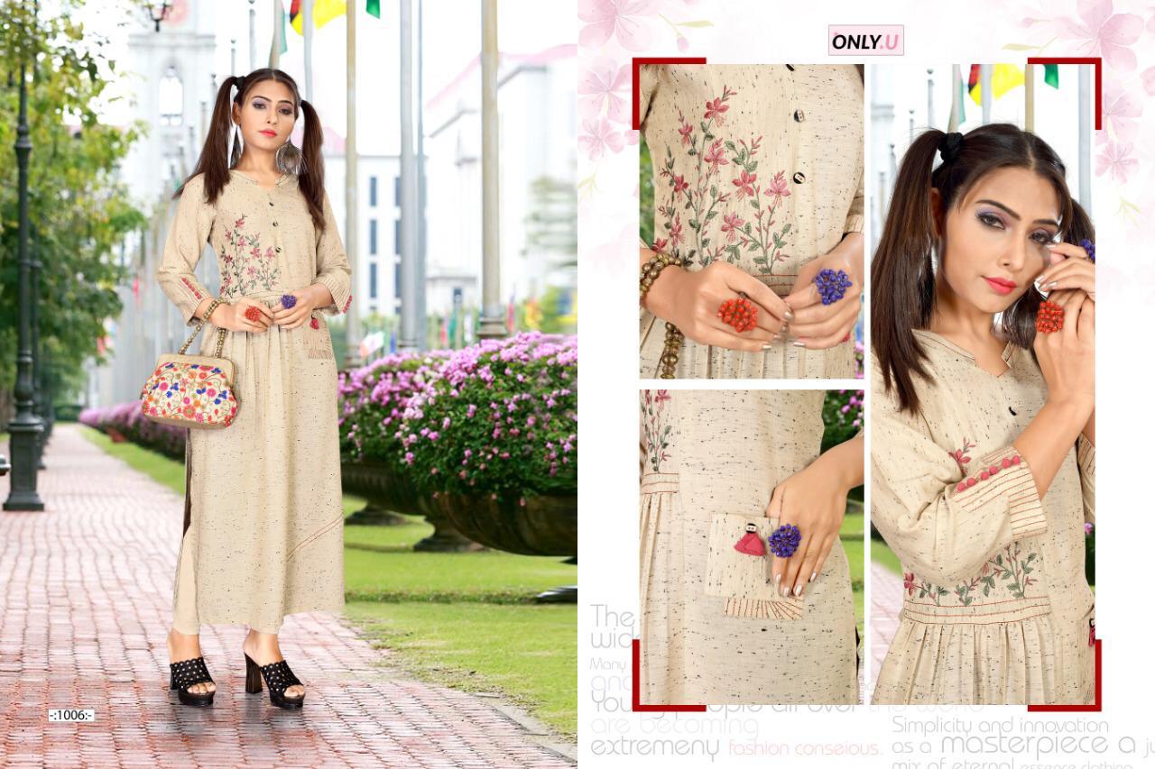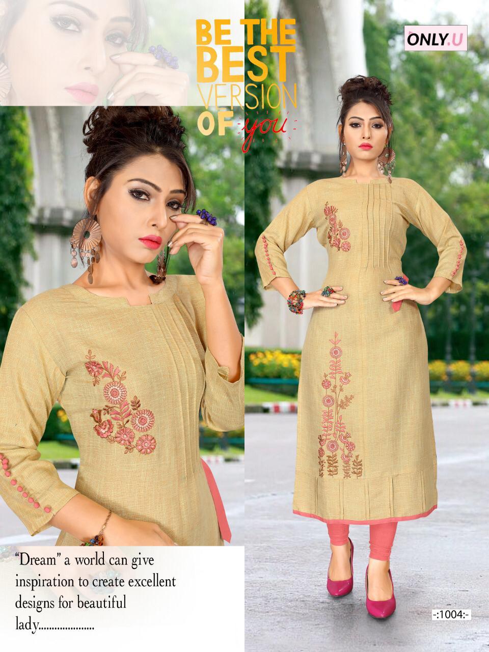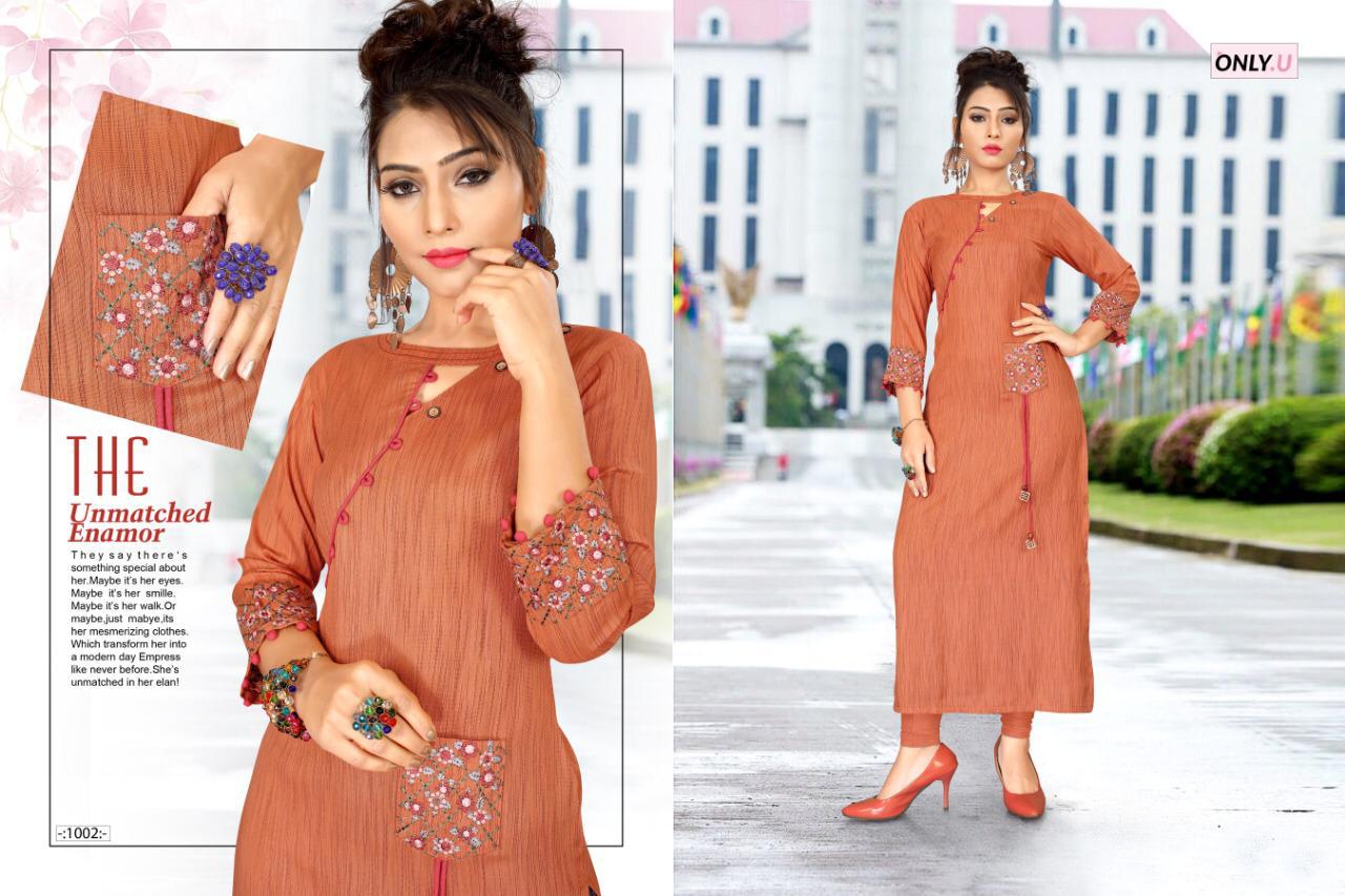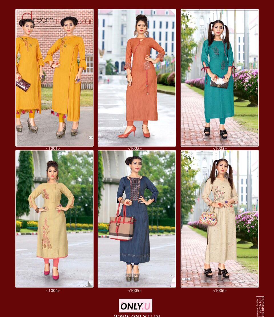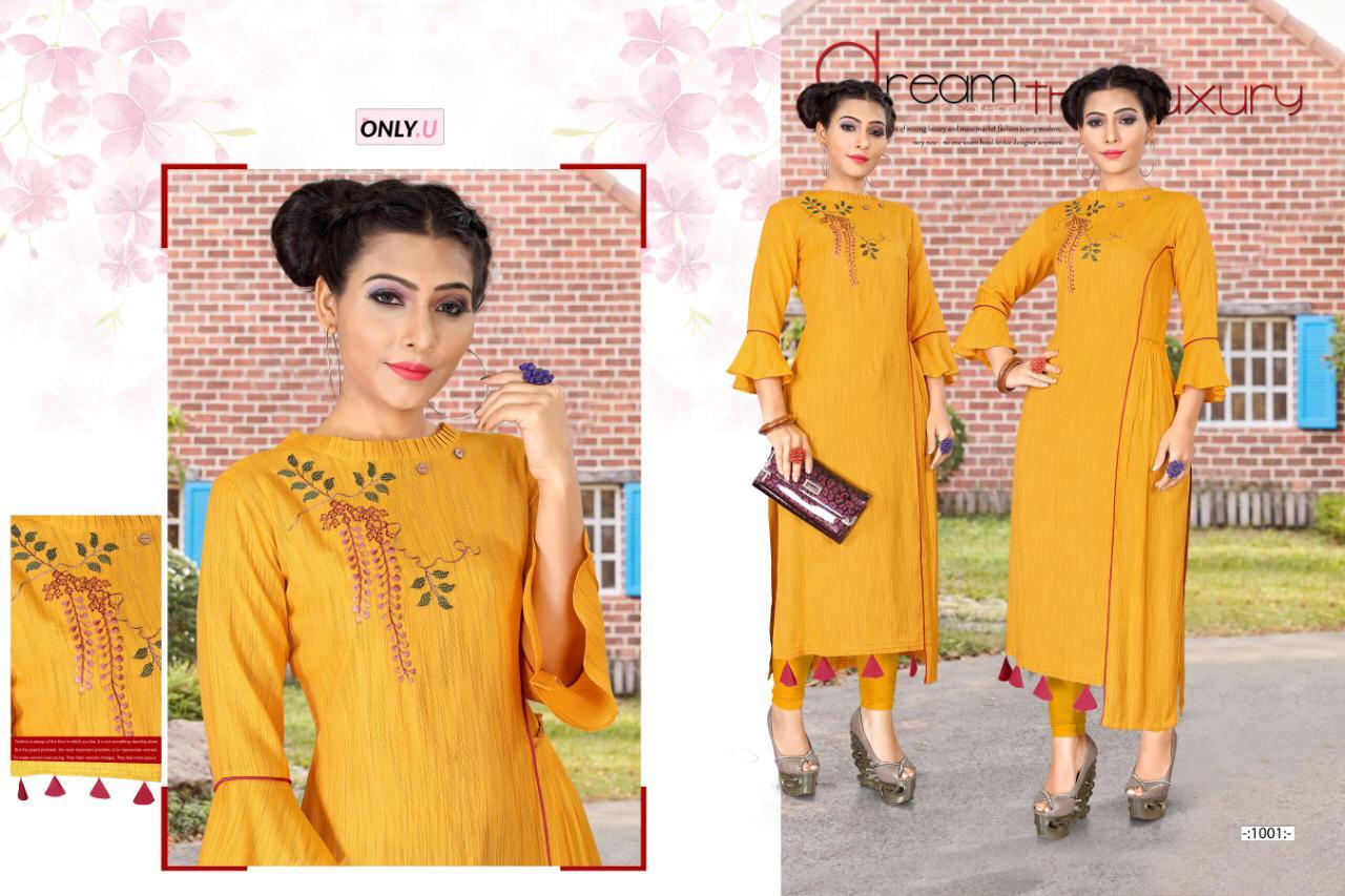 Buy Online Awesome Amaira By Only U Reyon Kurtis Collection Supplier Gujarat 6 Pcs of Full Catalogue at Wholesale Price. Looking for Awesome Amaira By Only U Reyon Kurtis Collection Supplier Gujarat Full Catalouge at Best Price? Buy Now Awesome Amaira By Only U Reyon Kurtis Collection Supplier Gujarat at Wholesale Rate of Rs 3594 with Total 6 Pcs from authroized dealer and supplier of BRAND'S Brand. Cost of Each piece is just only Rs 599 which is very low and affordable price to resale the product in your retail store ,This is Surat based Wholesale Supplier & Dealer of BRAND'S Brand. Click on Brand name to Know more about BRAND'S Brand's products.Call or Whatsapp on 9898838984 for booking or enquiry